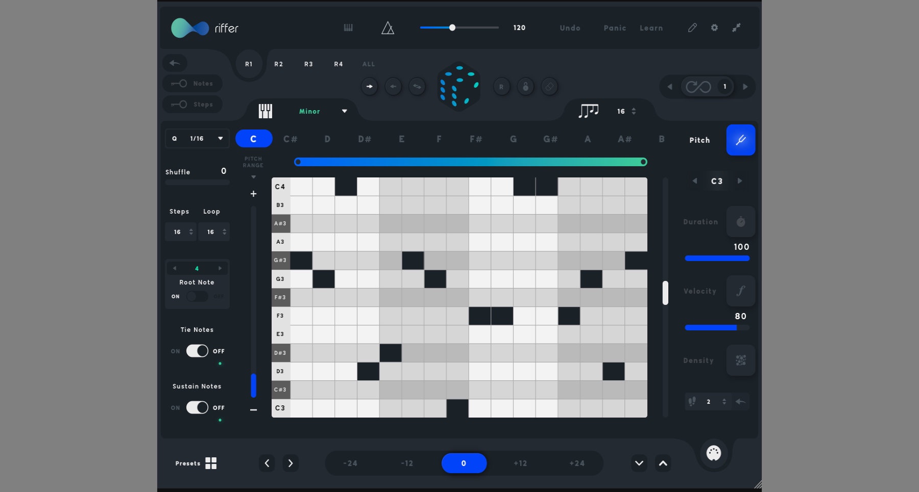 Ange tonhöjd och tonart och klicka sedan på tärningsikonen. Vips har pluggen randomiserat fram en tonal och rytmisk slinga ur ingenting, inklusive förslag på accenter och tontöjningar, om du vill det. Naturligtvis kan du låsa en sekvens och redigera den i Riffer och även i med breda penseldrag som att höja eller sänka tonhöjden i efterskott.