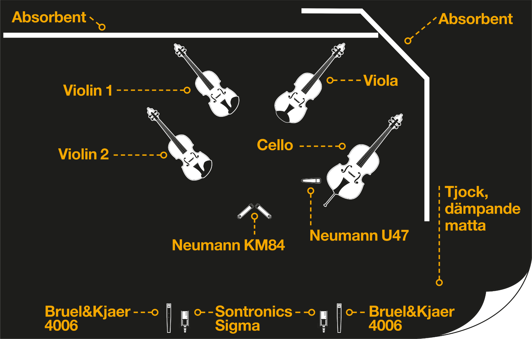 Som komplement har Willem sedan satt upp ett par Neumann KM84 i en xy-konfiguration. Mickarna är placerade mitt i kvartettens halvcirkel, en meter upp och i linje med förstafiol och cello.