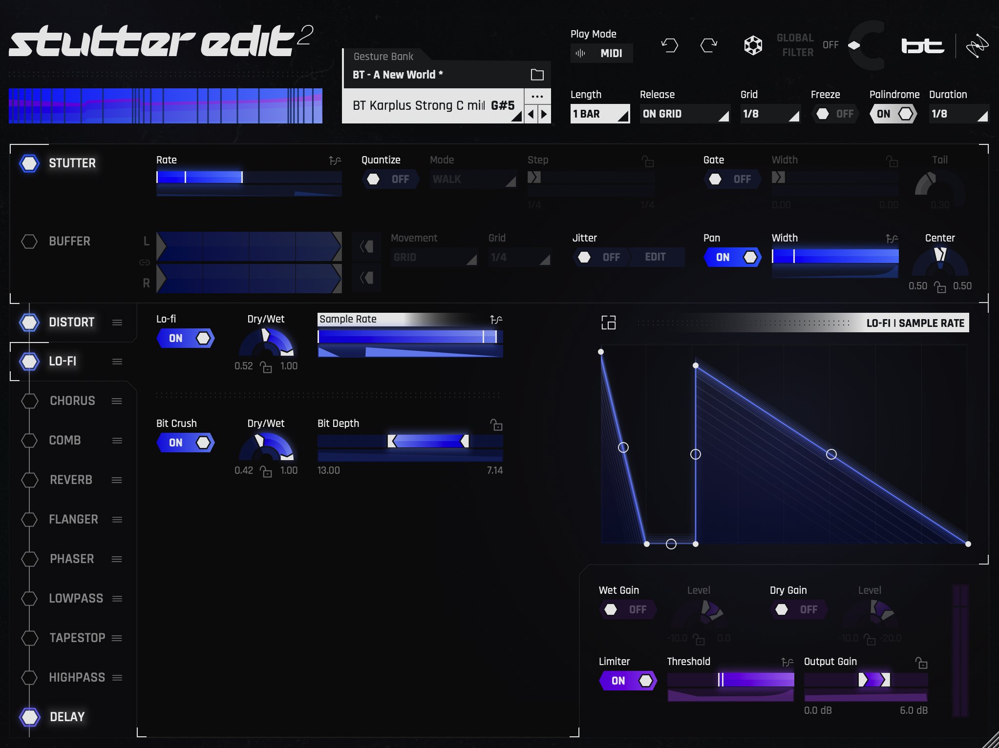 Den nya versionen är ett samarbete med den emblematiske producenten Brian ”BT” Transeau. Han har, bredvid modularfantomen Richard Devine, ett slags inofficiellt världsrekord i pluggsamarbeten. Faktum är att han även var inblandad den första versionen av Stutter Edit, då med en omfattande bank med förinställningar. I och med Stutter Edit 2 har samarbetet fördjupats eftersom BT:s logotyp återfinns sida vid sida med Izotopes och producentens förinställningar dominerar utbudet med mallar att utgå från när du slöjdar dina egna.