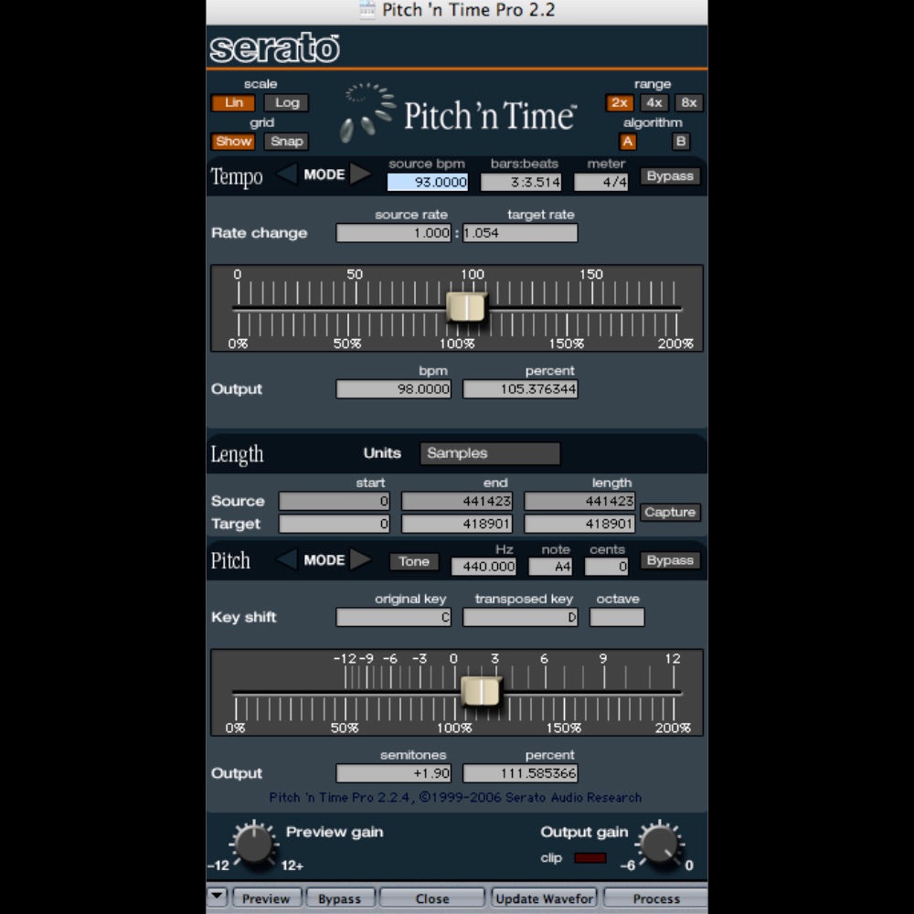 Sätt 93 som originaltempo och 98 som måltempo. Tonarten brukar vara definierad som C i utgångsläge. Den ska alltså transponeras till D alternativt plus två halvtonssteg. Därmed sitter vi med en originalloop i raskare tempo och lite muntrare tonart som utgångspunkt.