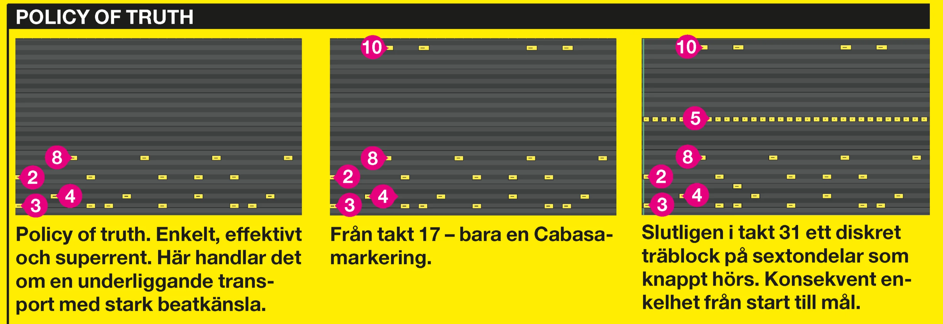 Policy of truth. Enkelt, effektivt och superrent. Här handlar det om en underliggande transport med stark beatkänsla.