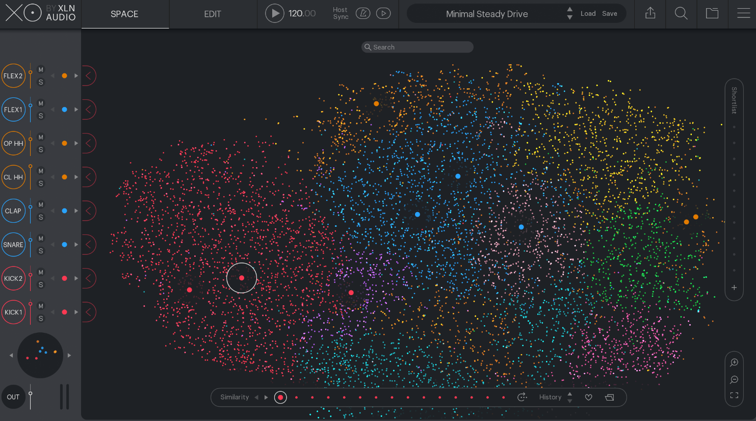 Genom att analysera och indexera samplingar visar XO en karta, där ljud med övervägande del diskant hamnar uppe i högra hörnet (hi-hats, shakers) och samplingar med mycket basfrekvenser (kickar) hamnar nere till vänster. Virvlar, och effekter syns i de centrala delarna i gränssnittet. De olika kategorierna visas med färger och när du styr pekaren över trumrymden spelas ljuden upp i realtid.