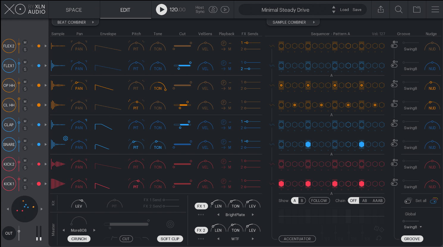 Det går mycket fortare att välja rätt ljud och plocka ihop ett trumkit jämfört med att sitta och leta filnamn i foldrar. Under ”Edit” återfinns en 8-spårs groove-maskin med extra allt. Du har tillgång till reglage för sådant som volym, tonhöjd, anslagskänslighet, filter, swing,