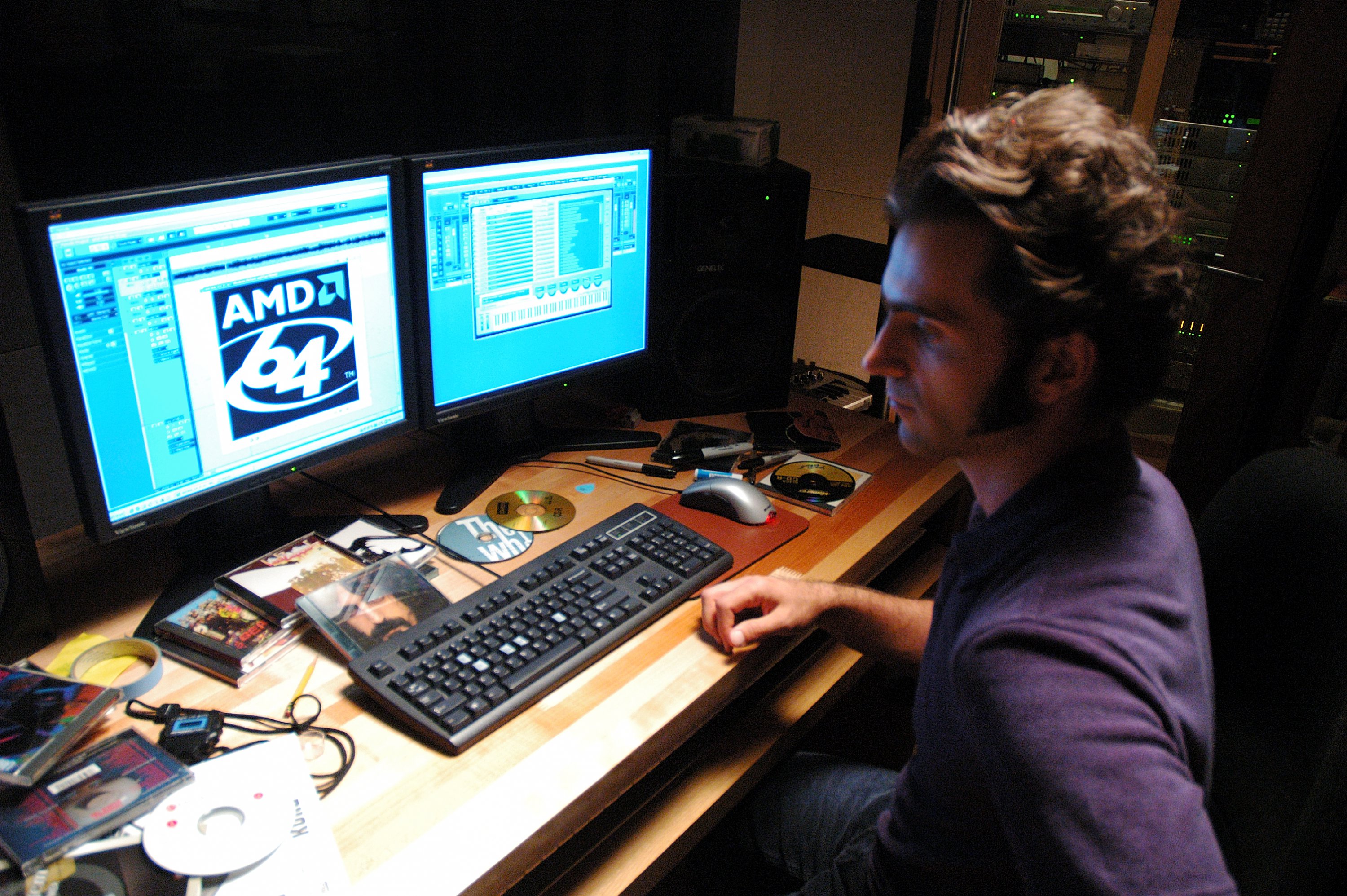 Pressbild med Dweezil i sin AMD-bestyckade studio från ca 2005.