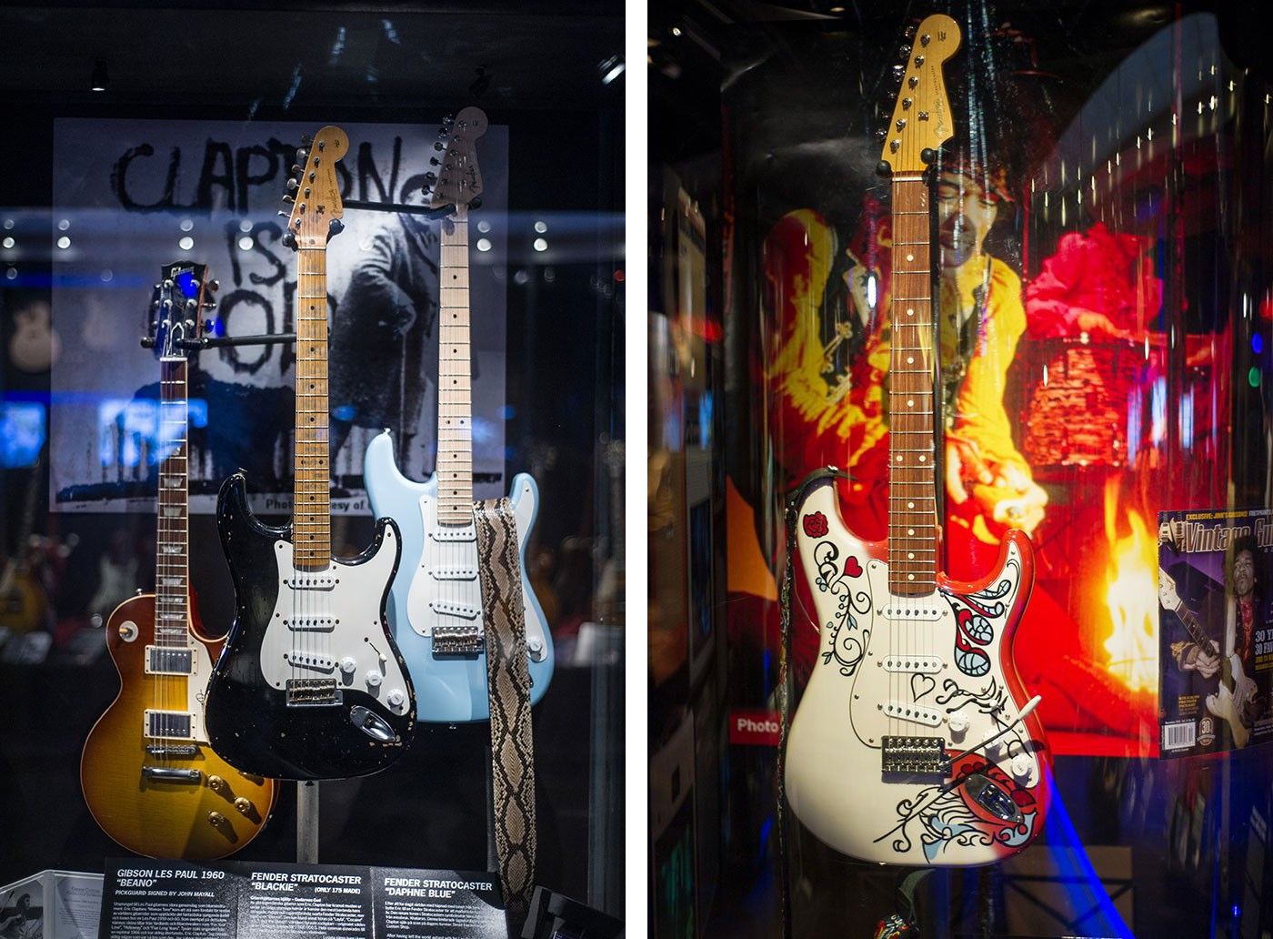Till vänster: Eric Claptons gitarrer, med "Blackie" i mitten. Originalet såldes för nästan en miljon dollar på auktion år 2004. Tlll höger: En återutgivning av den berömda Stratocaster som Jimi Hendrix eldade upp på Monterey-festivalen. Dweezel Zappa äger originalgitarren. (Foto: Ivan da Silva).