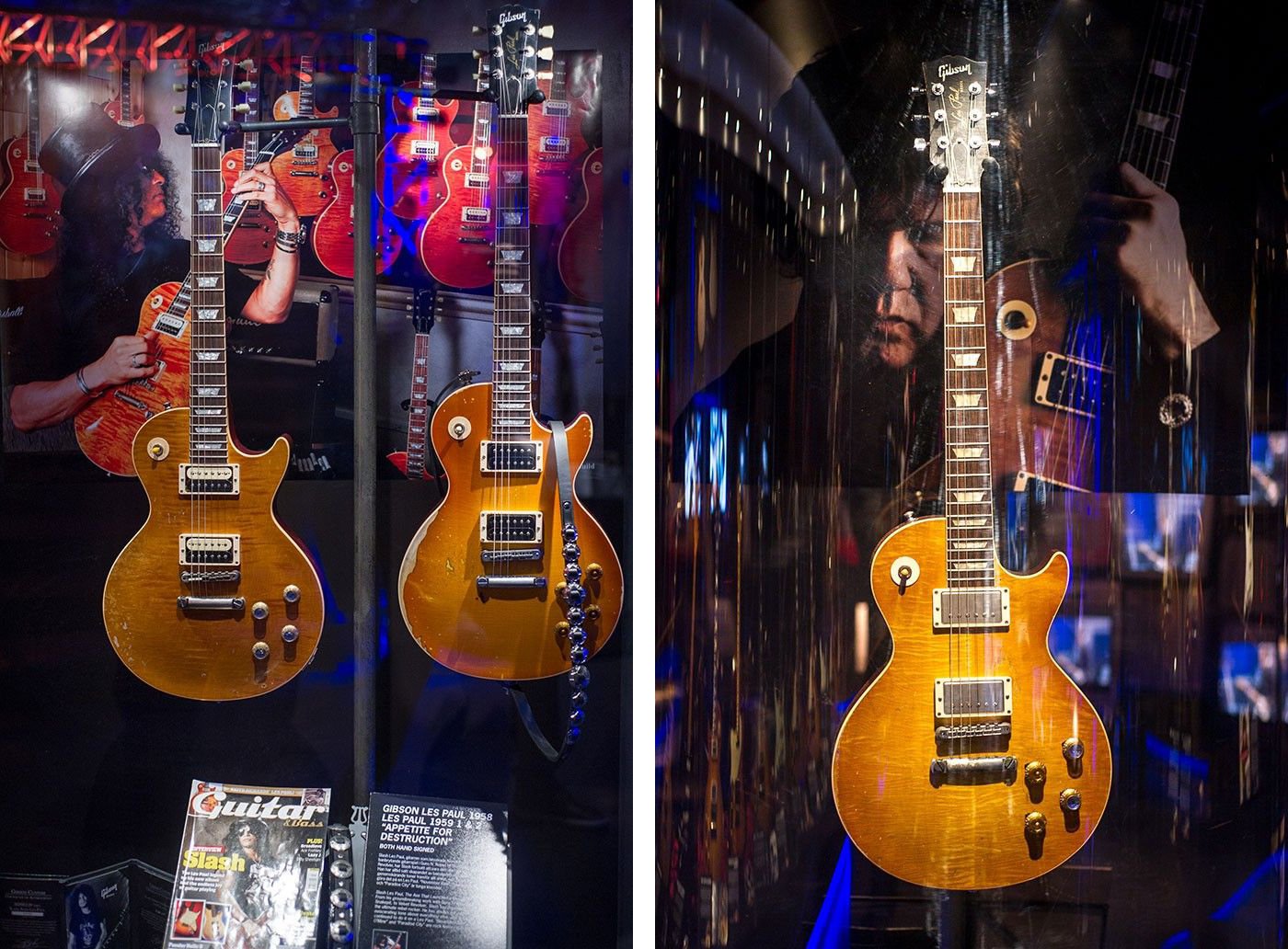 Till vänster: Två återutgivningar av Slashs berömda Gibson Les Paul-modeller (vänster i bilden). Till höger: En av världens mest mytomspunna gitarrer, Peter Greens Les Paul 1959, som senare köptes av Gary Moore och sedan Kirk Hammett. (Foto: Ivan da Silva).