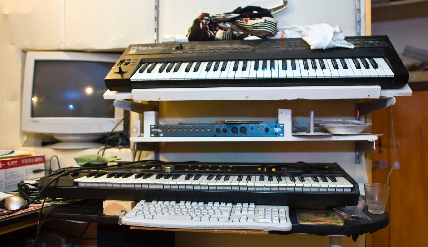 Två tusenkronorssyntar, Roland D-50 och Ensoniq SQ-1, och Erik Bodins ST Audio-ljudkort. Foto: Joachim Johansson.