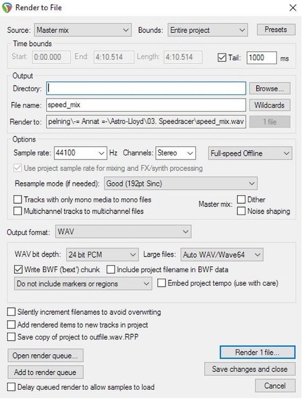 Bilden visar inspelningsprogrammet Reaper och inställningarna för export.