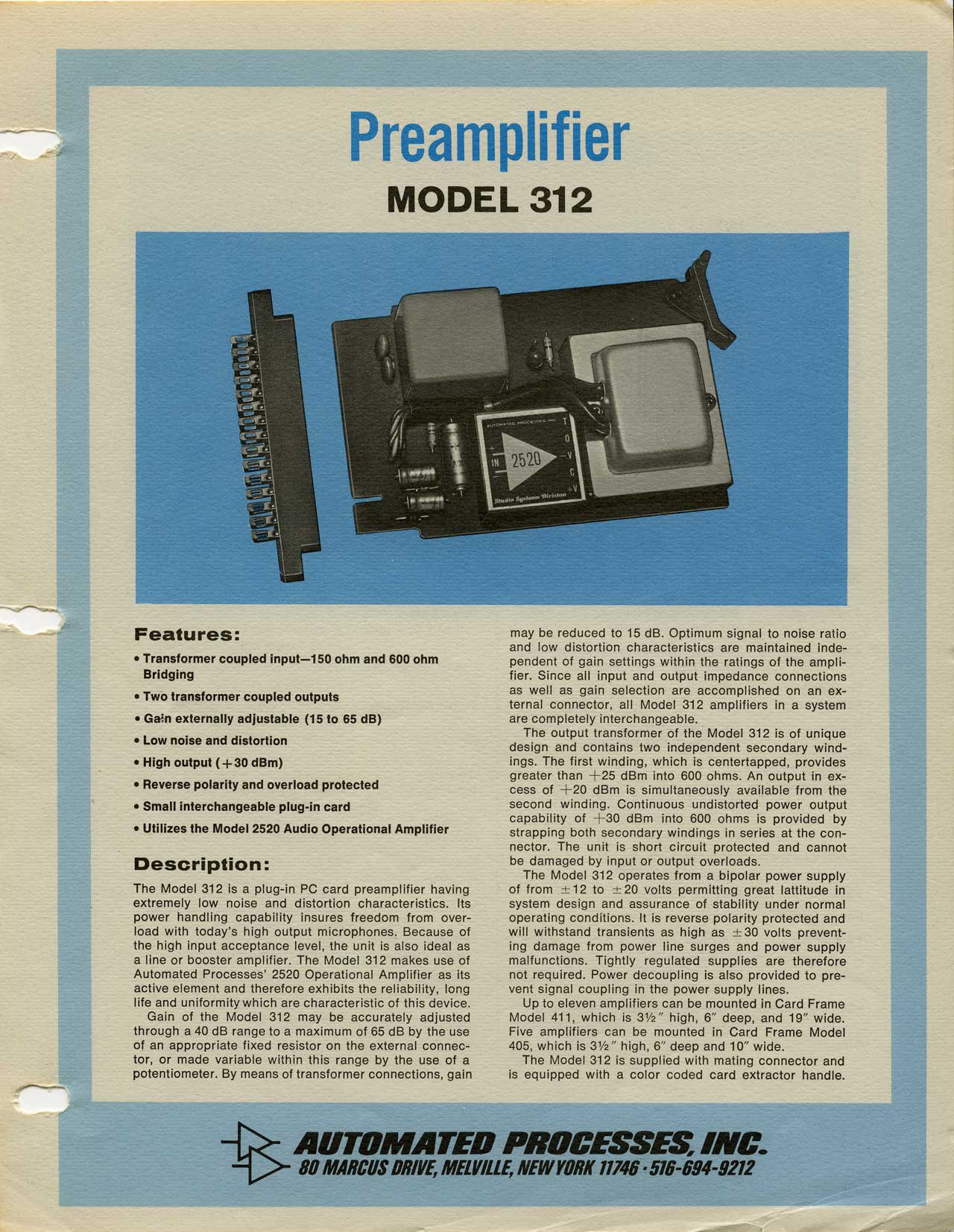API 312 är en amerikansk mikronfonförstärkare med anor från slutet av 60-talet. Den ingick i en serie enheter som var grundstenarna i Automated Processes INC:s stora modulära mixerbord.