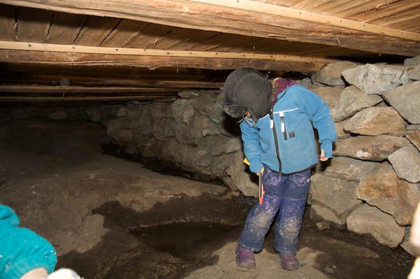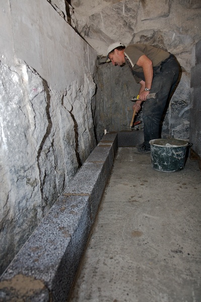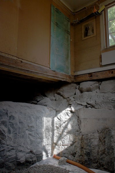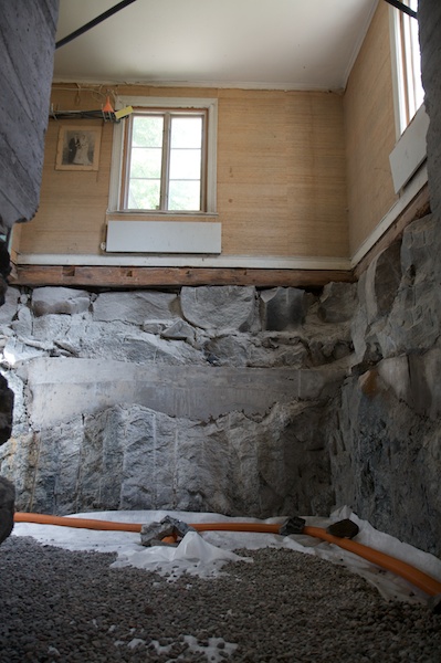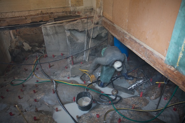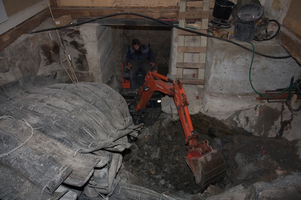 Tacoindian Postat 8 februari 2011 Trådstartare Postat 8 februari 2011 Nåväl, trägolvet på undervåningen är rivet och golvbjälkarna demonterade. Här pågår borrning inför sprängning. Det är dynamit som gäller - inget mesande. Med tät borrning och små salvor gick det bra. Sista hålraden närmast grund och skorsten görs med snigeldynamit. Själva sprängningen tog 4 dagar (exkl. borrning) och som mest sprängde vi ca 2m djupt. En liten grävare krävdes för att lyfta mattorna och lyfta ut krossen. Det blev fina stenmurar i trädgården av dessa... Skopan på grävaren är ungefär där den gula spaden låg på första bilden. I hörnet ser man fundament till kakelugn och murstock.
