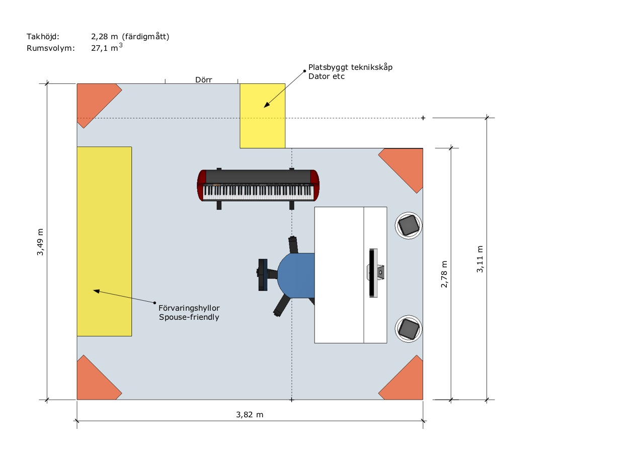 Tacoindian Postat 8 februari 2011 Trådstartare Postat 8 februari 2011 Här kommer en preliminär skiss, med en mycket prematur inredning. Som synes är utrymmet inte särskilt stort, knappt 12 kvm golvyta. Mitt på gavelväggen är en glugg, det är en inspektionslucka för kvarvarande krypgrunden. Den kan täckas, men måste vara åtkomlig, dvs absorbenter eller liknande måste lätt kunna flyttas. Har ritat in studiomöbel och stagepiano, samt på slängt in basfällor i hörnen. Vid sidan om dörren tänkte jag bygga ett väggfast skåp, för dator etc. Bakom mixplats tänkte jag sätta upp djupa hyllor för förvaring. Initialt var även långa väggen (nedåt i bild) belamrad med hyllor, men det tänkte jag försöka undvika pga symmetri. Återstår att se ifall det lyckas. Planritning Då till första frågan: När jag körde Bob Goulds Room Modes Calculator var jag lite osäker på vilket mått jag skulle använda som bredd, eftersom murstocksfundamentet (övre högra hörnet på bilden) för rummet assymetriskt. Jag använde det viktade medelvärdet (3,11m). Min tolkning är att rummet med dessa input har hyfsade förutsättningar. Nu återstår att se ifall jag får igång antingen REW (ny version släppt senaste veckorna) alt FuzzMeasure. Kontrollfråga på mätsetup: Monitorerna i tänkt position och micken i lyssningsposition? Dags att koja! Hoppas kunna mäta imorgon.