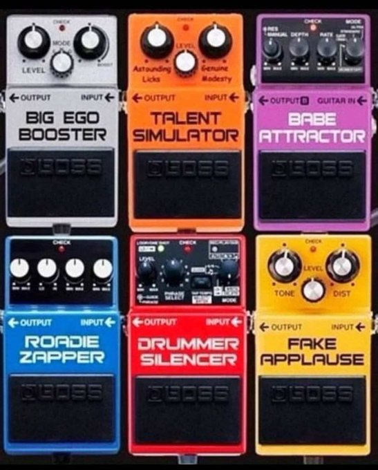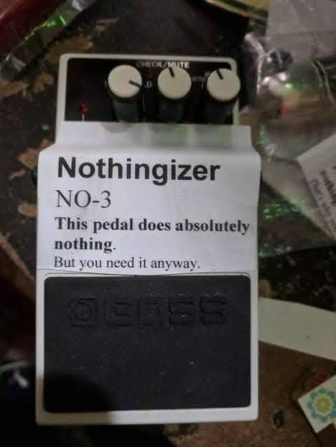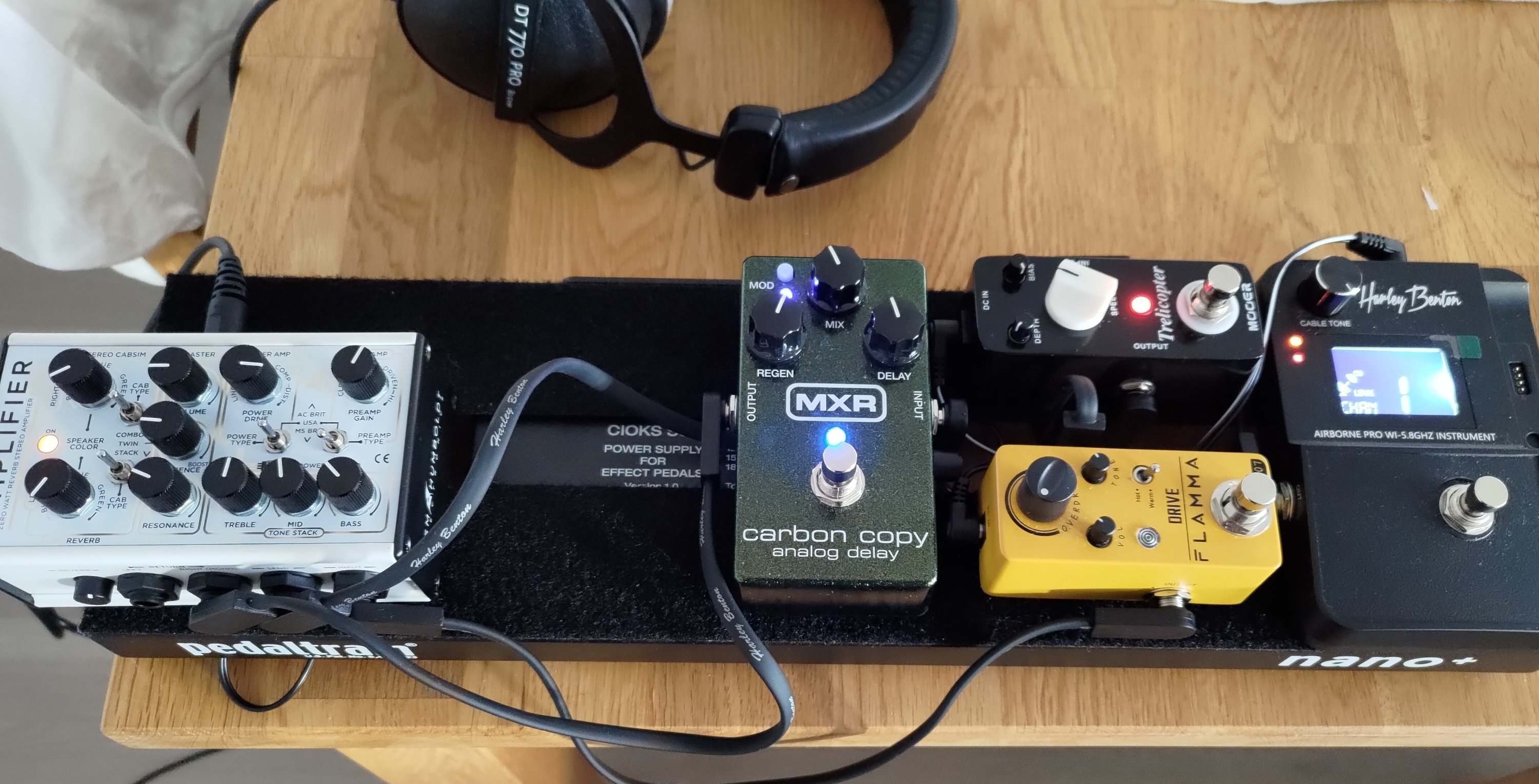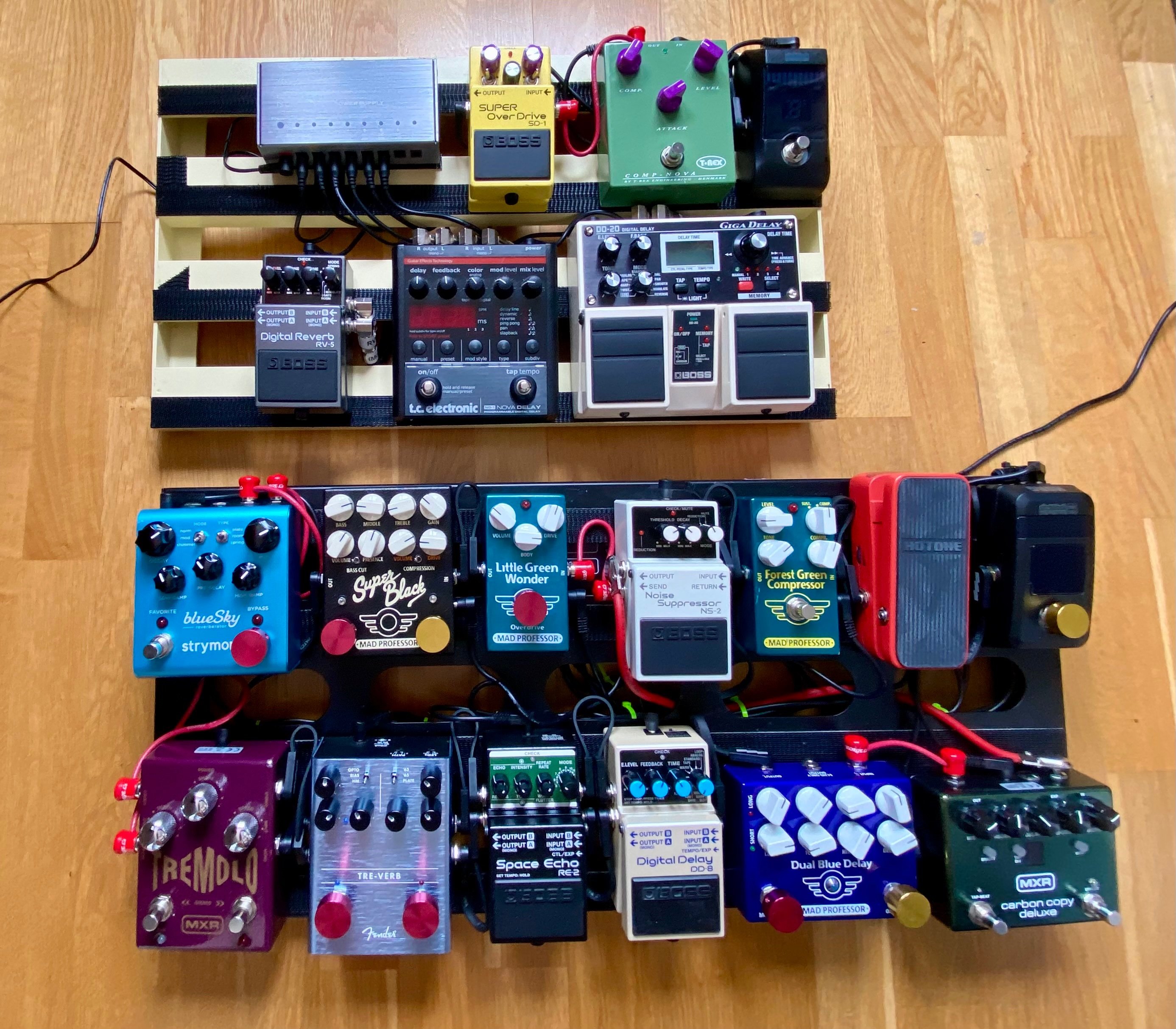 Okej, inspirerad av just ingenting alls plockade jag runt lite på det stora pedalbordet samt skapade ett helt nytt med 2/4 av de pedalerna jag haft liggande. Jag har kastat förfarandet med att köra tidsbaserade effekter i FX-loopen och kör I/O direkt. Spännande va? Lilla bordet fr hö KORG Pitchblack -> T-Rex Compnova -> BOSS SD-1 (Monte Allums mod) -> BOSS DD-20 -> TC Electronic ND-1 -> BOSS RV-5 De tre sistnämda är stereo I/O f ö PSU: Harley Benton ISO-2 Pro Stora bordet (teh Mothership) fr hö KORG Pitchblack Poly -> Hotone Soul Press (en expr/vol/wah kombopedal. Jag använder den dock enbart som vol-pedal för swells)-> Mad Professor Forest Green Compressor -> BOSS NS-2 -> MXR Carbon Copy Deluxe -> Mad Professor Dual Blue Delay -> BOSS DD-8 -> [stereo] BOSS RE-2 Space Echo -> Fender Tre-Verb -> MXR Tremolo -> Strymon BlueSky v1 I NS-2 FX-loopen sitter Mad Professor Little Green Wonder och SuperBlack. PSU: Palmer PWT12 That is all.4 poäng