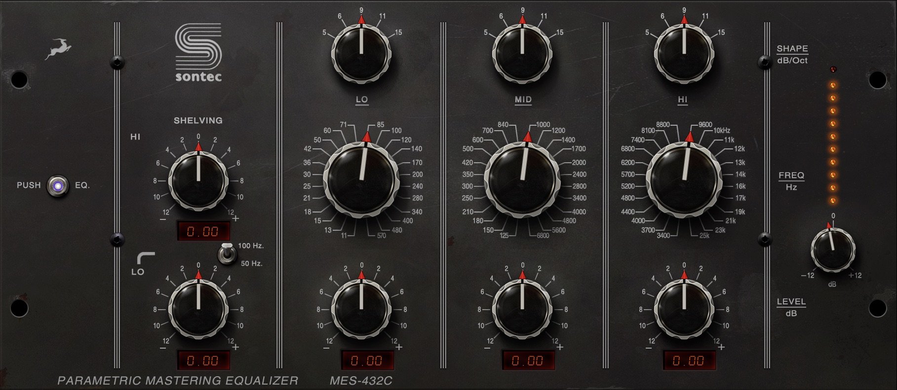 Effectively recreating Sontec’s mastering equaliser, MES-432C reclothes an absolute standard. Since its introduction in the late-Sixties, subsequently refined in the early- Seventies, it has remained the go-to mastering equaliser for fortunate old-school pros. Put it this way: with the inventor of parametric equalisation itself serving as its co- creator, the resultant design is, in all likelihood, destined — in its many reincarnations — to last forever. First listening can be deceptive, due to the EQ’s subtle-sounding nature lacking in any obvious mojo, maybe, but dig deeper into its controls and any audio benefits from particular and pleasant character enhancement. Everything seemingly sounds better — even poorly-executed equalisation choices! Antelope Audio’s MES-432C emulates exactly what that top-end mastering EQ does best, by squeezing extra drops of sweetness out of an already excellent-sounding mix that needs little in the way of additional polish. Indeed, it will serve just as well when put to work on a mix bus or onto individual tracks in need of frequency boosts or cuts here and there. Apply as many instances as needed without worrying about latency and CPU load. Let Antelope Audio’s Synergy Core audio interfaces handle it all, leaving more computer power for favourite instruments and effects. MES-432C likewise looks as great as it sounds, and is easy to use, including the following features: SHELVING EQ (LO/HI); LO, MID, and HI SHAPE dB/Oct (Q) controls; LO, MID, and HI FREQ (frequency) controls totalling 72 bands; LO, MID, and HI LEVEL dB (boost/cut) controls; and final volume adjustment.