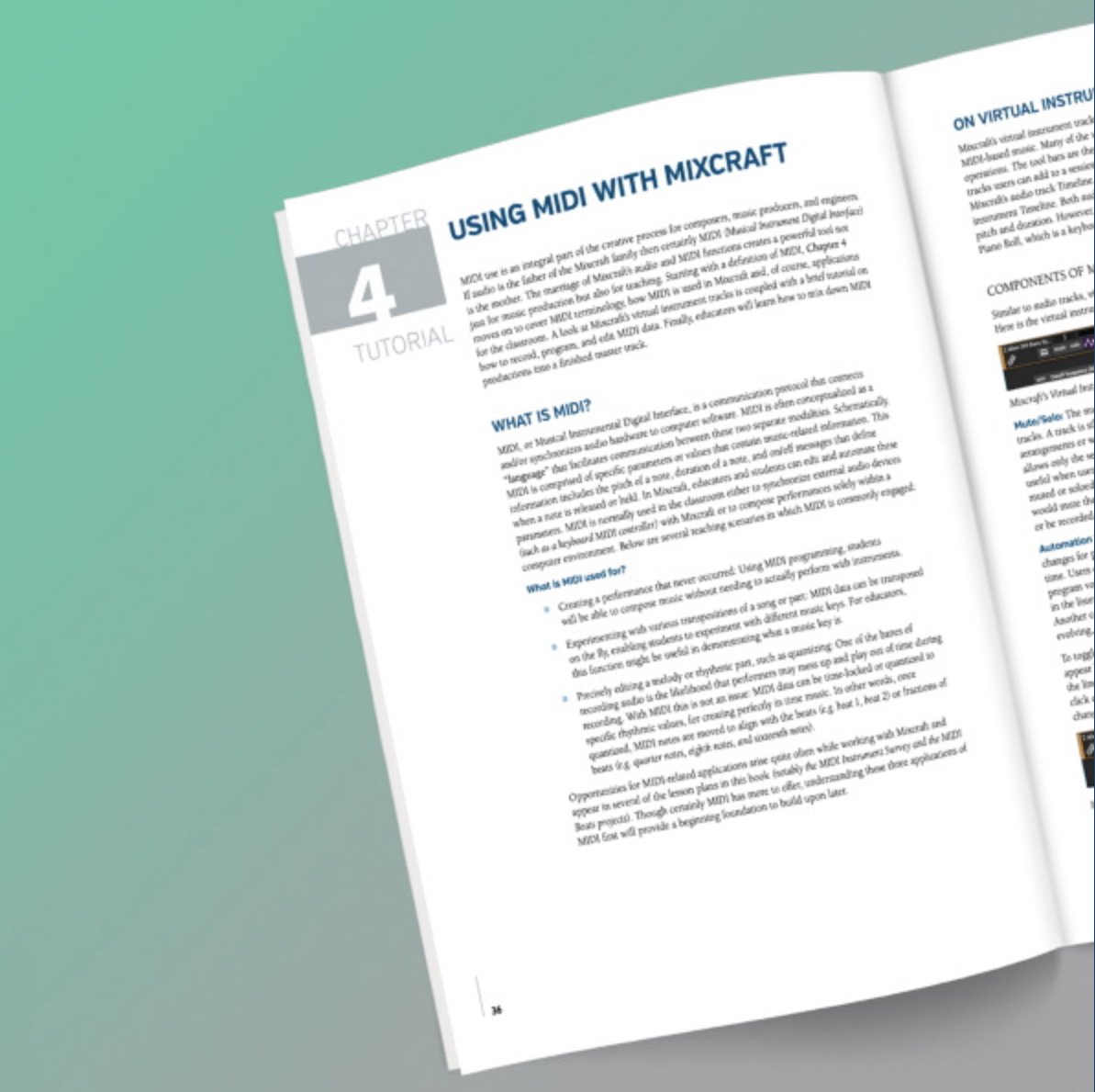 The Mixcraft Teacher's Guide includes a variety of smart and useful lessons on audio recording and production. In addition, there are a wide variety of engaging and entertaining lessons that stress creative writing, math, composition, and other fun and educational topics, including lyric-writing, podcast creation, and film scoring.