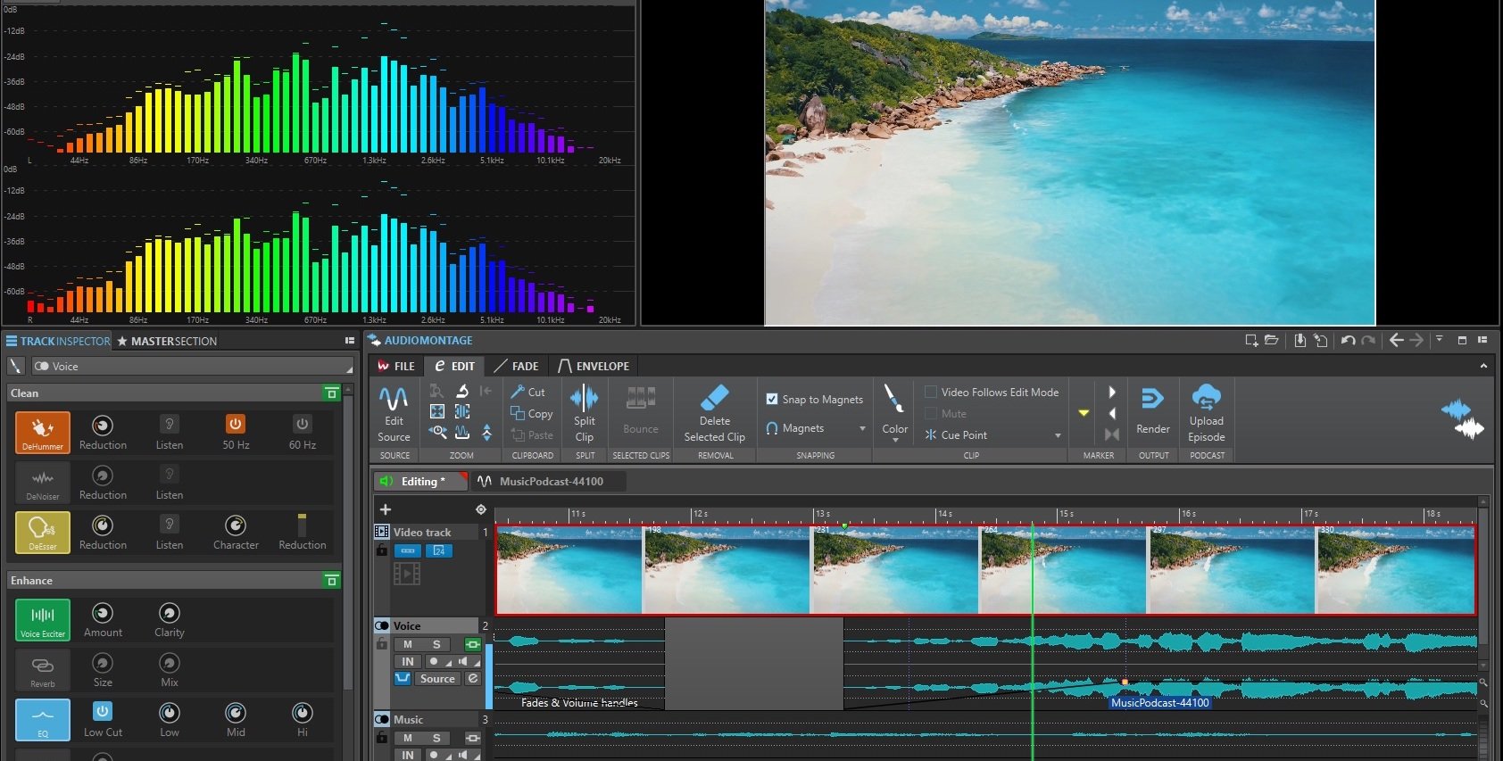 WaveLab Cast boasts a variety of editing, refinement and enhancement tools to increase the quality of audio recordings and turn any podcast into a professional-sounding and captivating show. The included sound correction tools remove unwanted noise or hum; the editing tools arrange audio parts and scenes as well as adding background music, applying an automatic ducking effect when detecting speech; the Track Inspector provides easy 2- band EQing; plus, there are many more tools for signal processing, such as the Voice Exciter, Compressor and Brickwall Limiter.