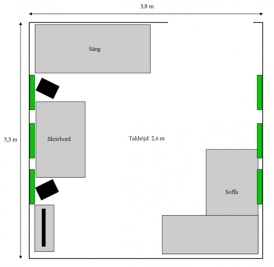 Nu har jag äntligen lyckats skaffa absorbenter (70 mm tjocka) till min hemmastudio. Jag köpte 6 st varav tre hamna på väggen bakom monitorerna och 3 på väggen bakom mig (se bild). På ena kortsidan är det en balkongdörr och ett stort fönster så därför jag inte kunnat sätta absorbenter där enligt spegelmetoden. Ljudbilden har blivit bättre men det är fortfarande en del ljud som studsar. Det största problemet jag har (tror jag) är att alla väggar är sten-/betongväggar. Vad kan man mer göra? Fler absorbenter? Takabsorbenter? I detta videoklipp kan man höra en tydlig skillnad före och efter akustikbehandling: Hos mig är det inte i närheten av samma resultat. Jag hör inte skillnaden i videoklippet när jag lyssnar i monitorerna men det gör jag i hörlurarna.