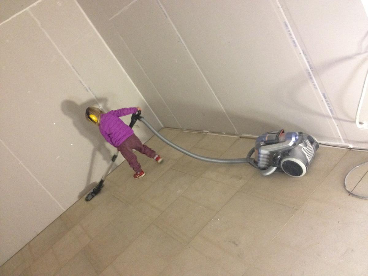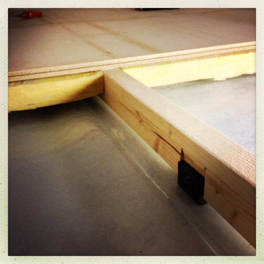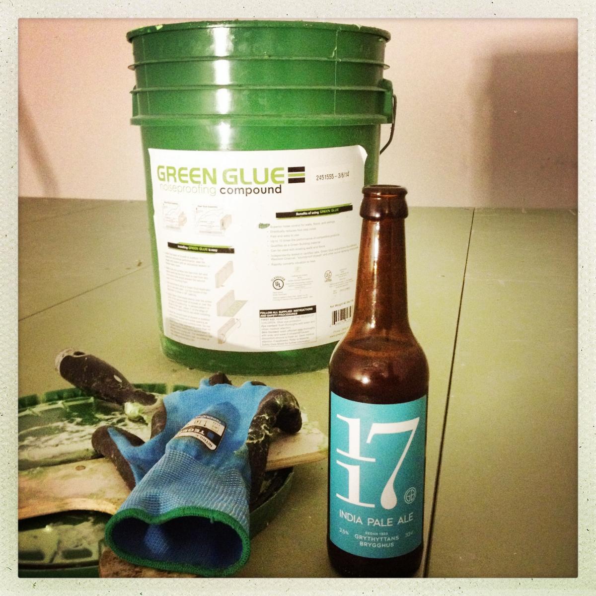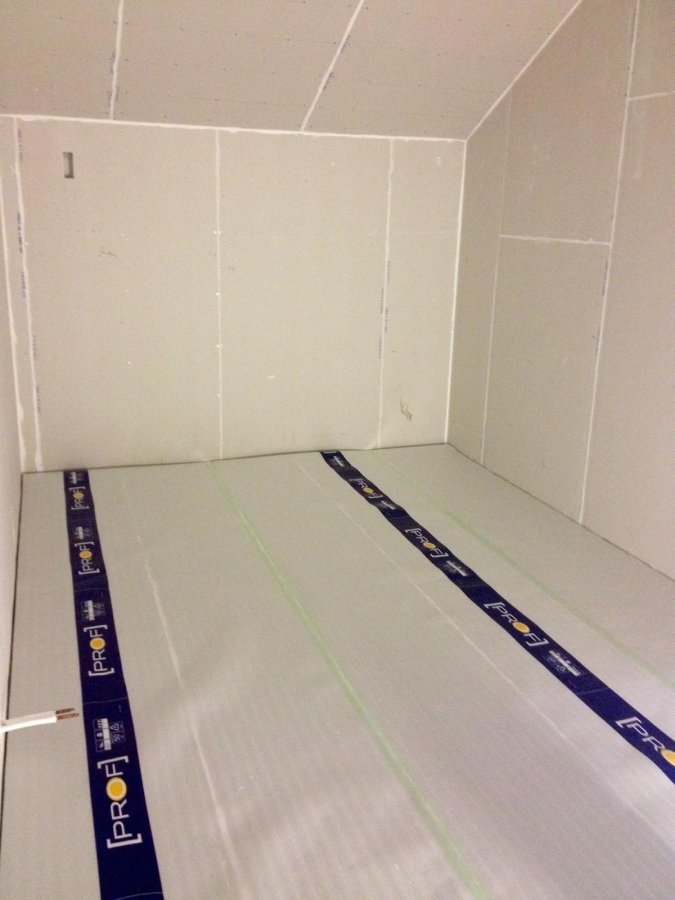 Fixa släp, åka till bygghandeln och köpa golvgips. Limmade med Green Glue och svor över hur vidrigt kladdigt det är (det är hemskt att få på håriga armar! haha!) och skruvade dit skivorna. Bonusen var att jag drack lite öl samtidigt så det blev lite roligare, det tråkiga var att när jag kollade på klockan var den 03:15, japp, på natten. Uff dagen efter var inte kul men golvspånet låg på plats! Yeah, one down öhhhh en driljard saker to go.... Blir så jäkla stökigt så jäkla snabbt, urk... Går mycket tid till att städa, plocka bort verktyg...'' Så fram med dammsugaren igen, den här gången fick jag dock dammsuga själv... Sen fick skruvarna sitta i cirka 24 timmar och när skivorna satt ordentligt fast i Green Glue så tog jag bort skruvarna. Sen fogade jag en massa skarvar med akustikfog, det gick åt mycket...