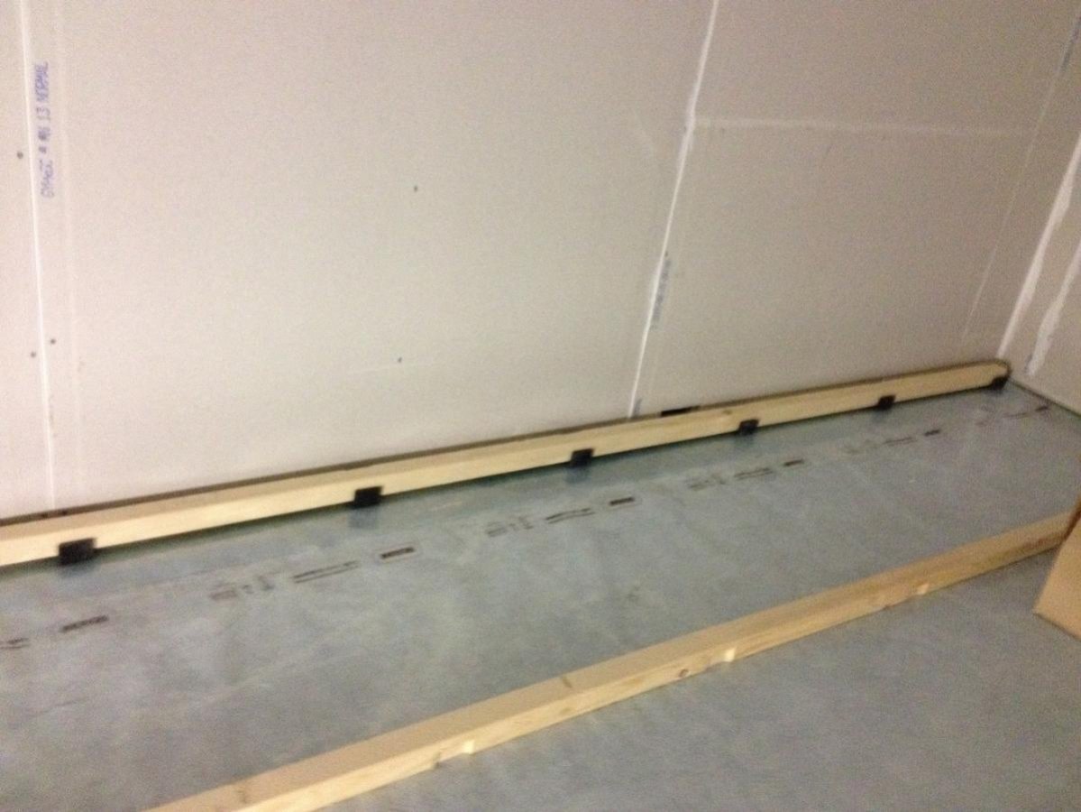 Så här ser de små hålen ut i innervägg så att luft kan flöda under golvet och ut på andra sidan och sedan ut genom kanalfläkten på vinden och sedan ut genom en kåpa på taket... Även här har jag bankat dit insektsnät i tjock metall, inga jäkla möss eller andra gnagare/tomtar/troll under golvet tack... Man ser också 45x45 regeln jag använder till golvet... Auralex U-Boats har tyvärr ett inre mått på 38 mm (standard storlek på konstruktionsregel i USA...) Fram med stämjärn och hacka ut 100 stycken hål, tog sjukt lång tid... Men.... som tur var så fick jag min far att göra det. haha! Oj vad han hackade och hackade... Vi provade med sticksåg men det blev inte så bra och vi ville inte paja bärigheten i reglarna mer än nödvändigt därav småpillet med stämjärn...