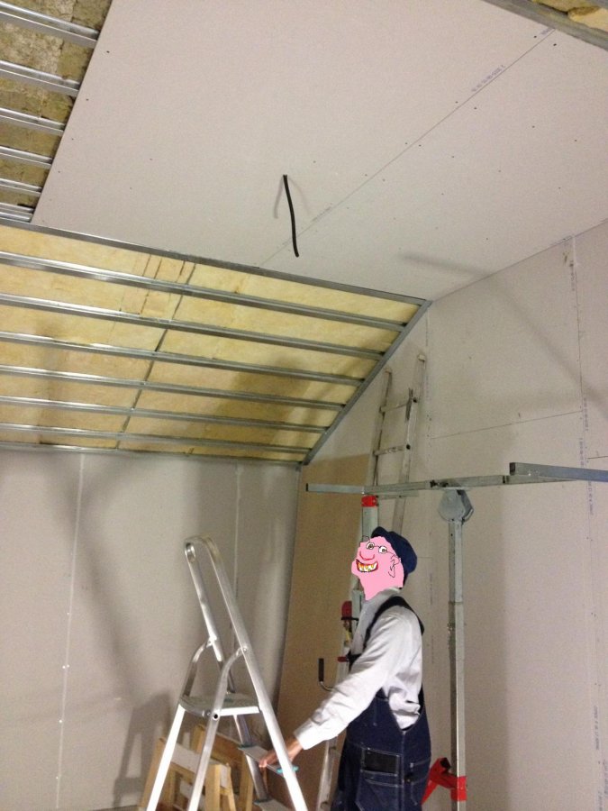 Här har jag börjat gipsa taket, åkte och hyrde en skivlift från Cramo, kostar ca 90 kronor per dag. Det är ett måste, hur skulle man klara sig annars? 3.50 meter i takhöjd tror jag det blev till slut.... Även taket gipsades två gånger med det klibbiga eländer Green Glue mellan lagren... och skarvarna försköts... alla glipor tok-tätades med akustikfog. Åh, ett nytt tips: först körde jag med Sikakryl från Beijerbygg det kostar 39 kronor tuben tror jag. Sedan när jag var på Jula så hittade jag något Holländsk fog som kostade 29 kronor per tub. Så vips så sparade man flera hundralappar på nolltid! Kolla Jula om du ska bygga, akustikfog går åt i MÄNGDER. Man kan också köpa i lösvikt men då måste man köpa en speciell sprutpistol till det så räkna på vilket som blir billigast är tipset... Att taket lutar gjorde det hela bra mycket jobbigare, att sedan inga vinklar stämmer 100% gjorde det ännu mycket pilligare... När man bygger i normala fall smackar man ju bara ihop gipset, eventuella springor/glipor/misstag får målaren ta när han/hon spacklar skiten ut tak/vägg. Det funkar ju inte när det ska ljudisoleras utan man få mäta/peta/mäta/peta/testa och göra det tills varje jäkla gipsbit sitter där den ska. Det tar faktiskt sjukt lång tid... Innan gips... Nästan färdigt... Färdigt!!!! Jippie! Upp med skumpan, på med musiken! Här jäklar anamma skall det festas och firas!!!! Jiiiiiihaaaaa!!!! Nej, crap, vänta här? Det var visst bara första lagret? Arghhhhhhhhh!!! Ok, påt igen och denna gång med Green Glue och glöm inte flytta på skarvarna, damn...