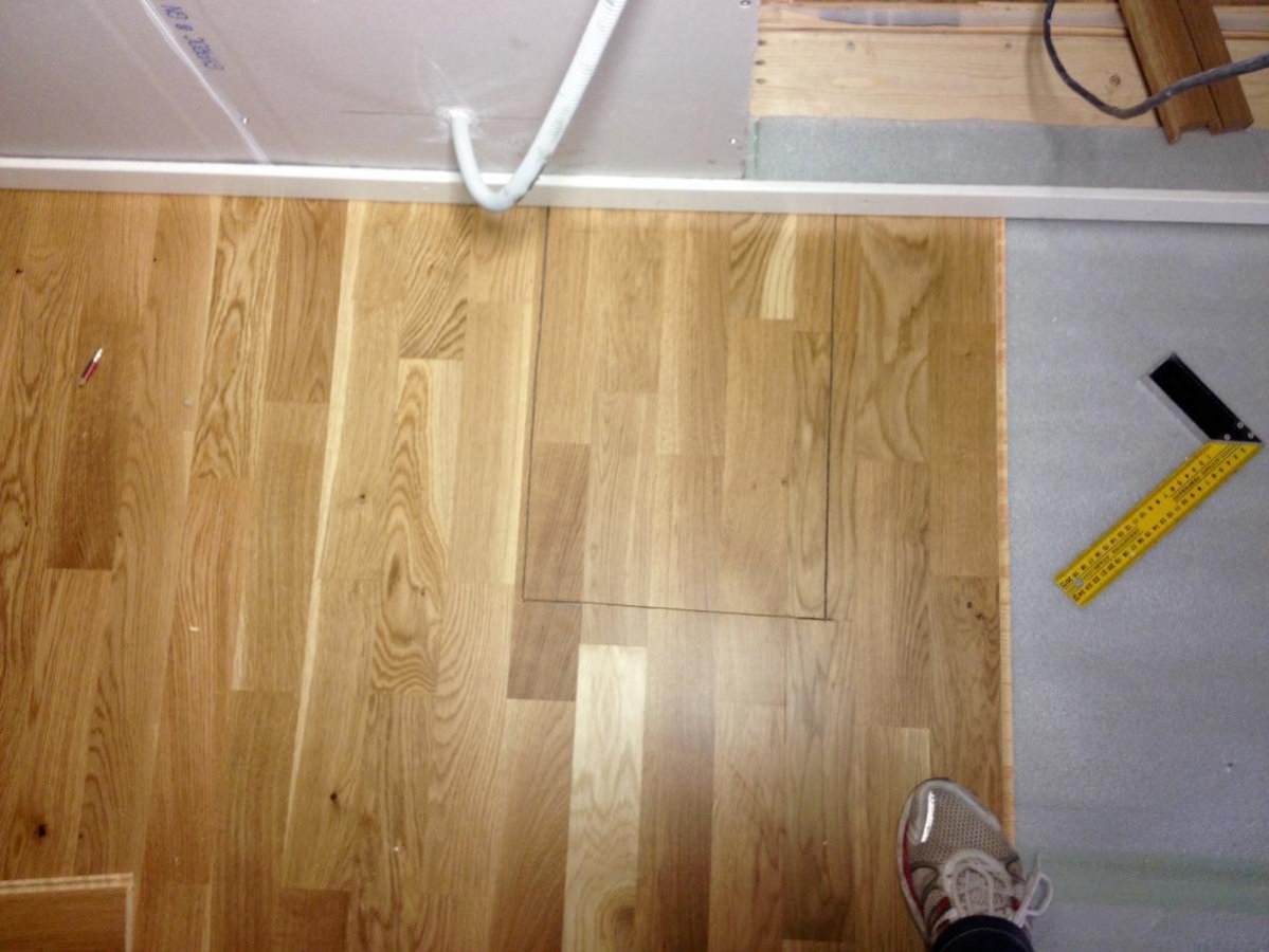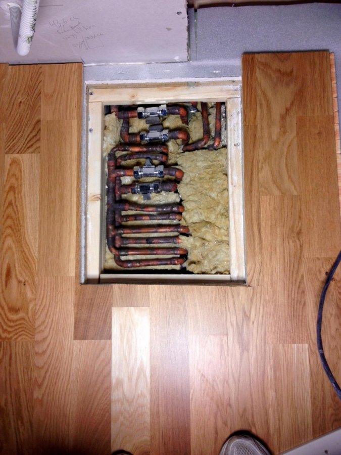När golvet skulle läggas så insåg jag att en hög med rör som givetvis finns mitt i golvet låg för högt... Men va i själva /&)&/Eydh%¤¤¤%!!!!! Vad göra? Jo ringa rörmokaren och jätte snällt fråga "Kan du tänka dig och komma hit och kapa rören ännu en gång och fälla ned dom närmare betonggolvet, behöva bara komma ned ca 2,5 centimeter! Snäääälla!!!!?" Dessa rör stod nämligen rakt upp förut, mot en vägg och var inbyggda i en låda av trä... Inget man tänkte på förut, men i och med bygget så gjorde jag ju om planlösningen lite och vips, tadaaaaaa, så stod de här förbannade jäkla rören upp 50 centimeter rakt upp ur betongplattan precis VID DÖRREN in till studion... Röris kom och kapade ned rören så långt det gick och gjorde ett grymt jobb att få rören att näääästan slicka golvet.... Nu visade det sig alltså att rören ändå låg för högt upp... Jag kan ju inte ha en tunn inspektionslucka i golvet och förlora 40x30 centimeter ljudisolering... Ok, vad sa då rörmokaren då till slut? "-Men, alltså, du kan ju bara sala på golvreglarna med 2,5 centimeter så kommer ju CeminWooden upp ovanför rören!" "-Oj, hoppsan, ja just det, tänkte inte på det... Glöm att jag ringde... Hejdå!" Sagt och gjort, åkte och köpte material för att sala på och det fungerade toppen!!! En bonus är att luftspalten under golvet blev rejälare och det känns tryggare... Now you see it... Now you don´t... När sedan parkettgolvet i ek ska läggas så kommer jag limma fast bitarna på inspektionsluckan och sätta dit en list i metall runt luckan. Kommer bli toppen! Lyckan var faktiskt stor när jag insåg att det fungerade och de satans rören försvann i golvet! Tack röris, du är också en hjälte! 🙂