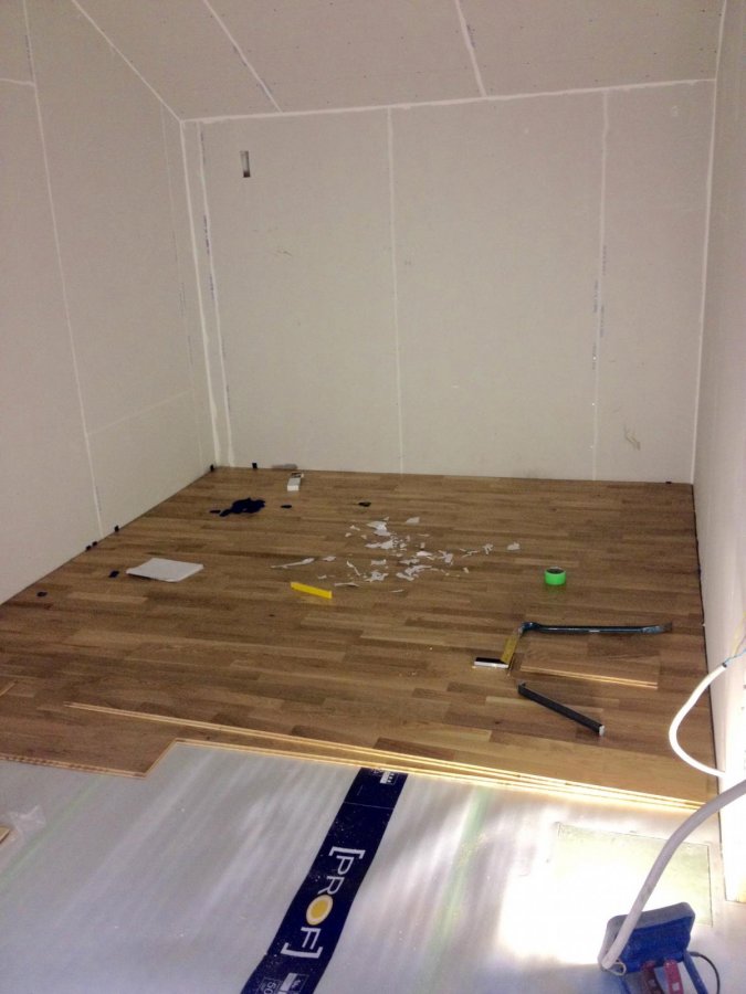 Efter några dagars paus var det dags att ge sig på parkettgolvet i ek. Smack, på med rallyränder i blått, mycket viktigt för att få rätt känsla i baskaggarna! 😉 Nej det är bara underlags foamen... Som vanligt trodde jag det skulle gå galet snabbt att bli färdig... Men crap vad det tar tid... När jag äntligen fått upp farten stötte jag på The Inspektionslucka From Hell!!!! Det tog då givetvis ännu längre tid. Men jag tror det blir helt OK när jag fått dit lite tunna metall lister runt luckan. Funderar på att slänga dit ett durkslags beslag så man lätt kan lyfta upp luckan om man behöver stänga av någon del av vattnet någon gång... Rören från helvetet... Skruvade dit golvgips ovanpå CemInWood... Luckan är minst fem centimeter tjock i färdigt skick så det kommer nog inte läcka speciellt mycket ljud där... Tadaaaa, färdigt minus listerna som jag måste köpa innan det blir helt färdigt... Det roliga är att det nu börjar se ut som ett riktigt rum! Ska lägga det sista av parketten imorgon. Sen är det målning, dörrar och lister kvar plus eldragning, lite grejer med ventilation och sen smack kabooooooooooooooooom är hela klabbet färdigt! Med lite tur så kommer Björns firma Akustikfixarna och mäter rummet i slutet av oktober och efter det blir det akustik-fixning och sen upp och in med alla grejer och sedan, äntligen: Börja lira in musik igen! Kan säga att jag längtar mer än rejält att få allt färdigt! 🙂