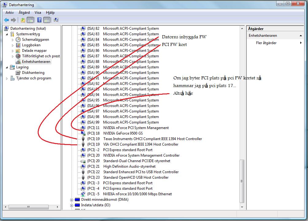 Jag vet inte om den har nForce 4 chipset, har letat och det ända jag hittar är att det heter nForce 630i Jag tror att GS modellen sitter å sånnahär burkar som jag har, (t.ex elgiganten) Jag vet inte om den använder Ram som grafikminne. Men jag har 4gb. Ja jag har också tror att det skulle vara en IRQ konflikt, så därför beställde jag PCI FW kortet. Och visst det funkar bättre om jag sätter i det. jag ska ta en print screen så får ni se. sådärja, kanske de kan hjälpa?