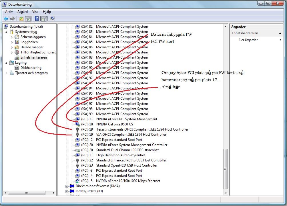 Uppdatering. Köpte ett Firewire kort från Exitdata. Samma problem fortfarande, dock lite bättre, men så fort jag gör någon häftigt eller snabbt med "grafiken" så hackar musiken eller tystnar helt. Jag testade byta PCI plats, (har 2 lediga) Men då blev det precis lika som förut. Kan jag göra något i grafikinställningarna? Behöver alla tänkbara tips jag kan få nu 🙁