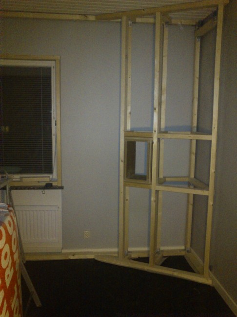 Har inget speciellt för mig, så kan lika gärna fortsätta berättelsen. Det här rummet har varit garage och ska bli inspelningsrum. Högt till tak och tjocka betongväggar. Tanken här är att isolera rummet genom att bygga ett rum i rummet (nåja, nästan iaf). Målet är att kunna spela trummor utan att resten av huset störs så mycket, samt att grannarna på lugna gatan inte störs när de tvättar bilen eller klipper gräsmattan. Rummet ska byggas på sådant sätt att det lätt går att återställa om man vill avveckla studion i framtiden. Golvet är gjutet ovanpå ett äldre garagegolv, och är utrustat med golvvärme. Ingång till resten av huset. De två svarta rören på vänster hand är bergvärme. När pumpen startar låter det en del, men det räknade jag med att isolera bort. Kopparrören går till själva golvvärmepumpen. Regelverk. 95 mm regel i tak, 70 mm i väggar, med 25 mm luftspalt mot gammal vägg. Taket måste ha plats för ventilation och spotar. Tror vi sänkte det ca 30 cm allt som allt. 2,90 meter takhöjd när rummet är färdigt. Så här i efterhand inser jag att trä inte är det lättaste materialet att bygga med. Nästa gång blir det stålreglar. Forts...