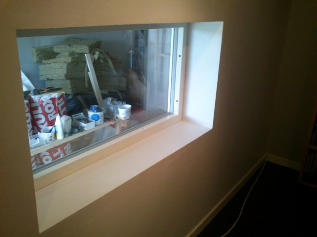 Det är ett andra fönster det är frågan om. Det första är ett fabriksbyggt vanligt treglas med argon i, har jag för mig. Det är säkert inte optimalt, men vi valde att köra med det ändå, mest pga att det var smidigt och att fönstret redan var inköpt. Den andra rutan blir förmodligen ett lamellglas, 8 mm tjockt. Det får duga. För tillfället är jag mest intresserad av att över huvud taget få igång studion. Att det blir lite läck vid t ex trumspel får jag ta. I vilket fall är jag riktigt nöjd med ljudet i kontrollrummet. När inspelningsrummet är färdigt kommer jag liva upp min gamla tråd med lite bilder. Första fönstret sitter i en uppreglad vägg, 95 mm tjock, varav 70 mm isolerad och resten luftspalt. Resten av väggen (originalväggen och där andra fönstret ska placeras) består av en slags ca 250 mm betongsten med luftspalter i. Fönstrets yttermått är ca 130 x 70 cm.