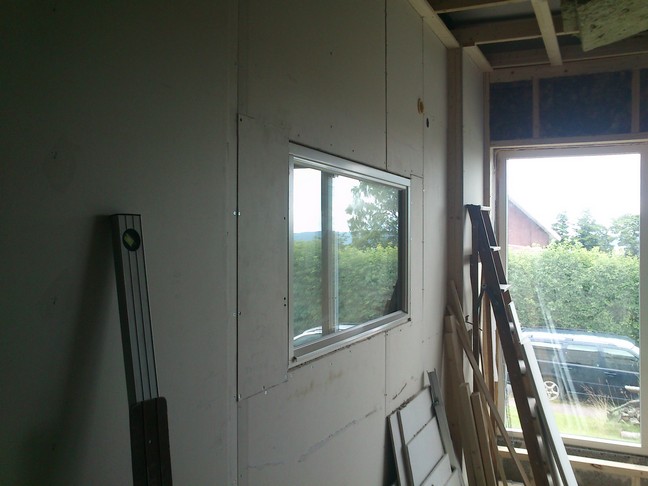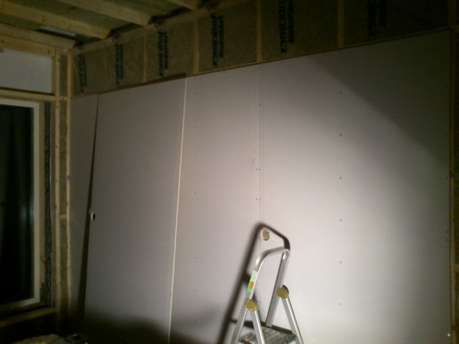 Isolering på. 70 mm. Gips på. Högtalarinkapsling i MDF. Alesismonitorerna har jag haft länge och jag känner dem väl. De är billiga och låter otroligt bra om de får rätt förutsättningar vad gäller rum och placering. Om de inte får det låter de inte så bra alls, vilket jag tror är anledningen till att vissa dissar dem. Isolering av tak. 2 lager med 95 mm stenull. Overkill kanske, vad vet jag? Nu är det gjort i alla fall. Ventilation längst in till höger. Gipsjobbet där blev väl kanske inte det bästa, men däremot det första jag någonsin företagit mig. Slutsats: Se till att få så få skarvar som möjligt när du gipsar en vägg! Det blir en hel del extra finishing att göra annars. Satte en väggdosa samt drog ett avloppsrör ganska högt upp, till höger om fönstret. Tanken är att montera upp en dataskärm där och dra vga-kabel i röret, för att kunna styra studion från inspelningsrummet via bluetooth, med typ en PS3-fjärrkontroll, eller liknande. Senare kom jag på att det kanske vore önskvärt att ha midi i inspelningsrummet. Om det blir nödvändigt kan jag alltid dra en midikabel eller två genom röret också. ...och där satte jag igen fönstrena. Hejdå, dagsljus! Lite isolering... Vet ej vad de kallas, men det ska upp spotlights i taket, och de där metallhinkarna är till för brandsäkerheten. Mer gips... Nu var det egentligen dags för gipslager nr 2. Men nu hade jag även kommit till en punkt då jag var trött på hela bygget. Jag valde helt enkelt att strunta i ett extra gipslager. Spackla kändes mycket roligare och mer "som om det hände någonting". Nu i efterhand tycker jag att jag gjorde rätt val. Som jag skrev tidigare, är fönstret det största isoleringsproblemet i mitt projekt. Forts...