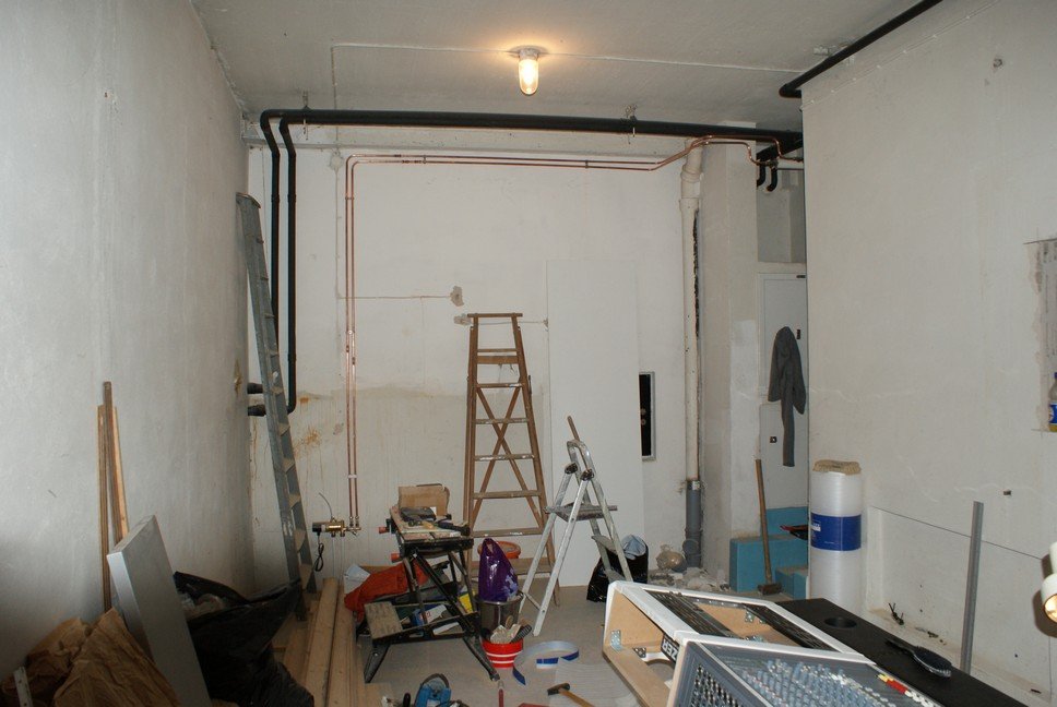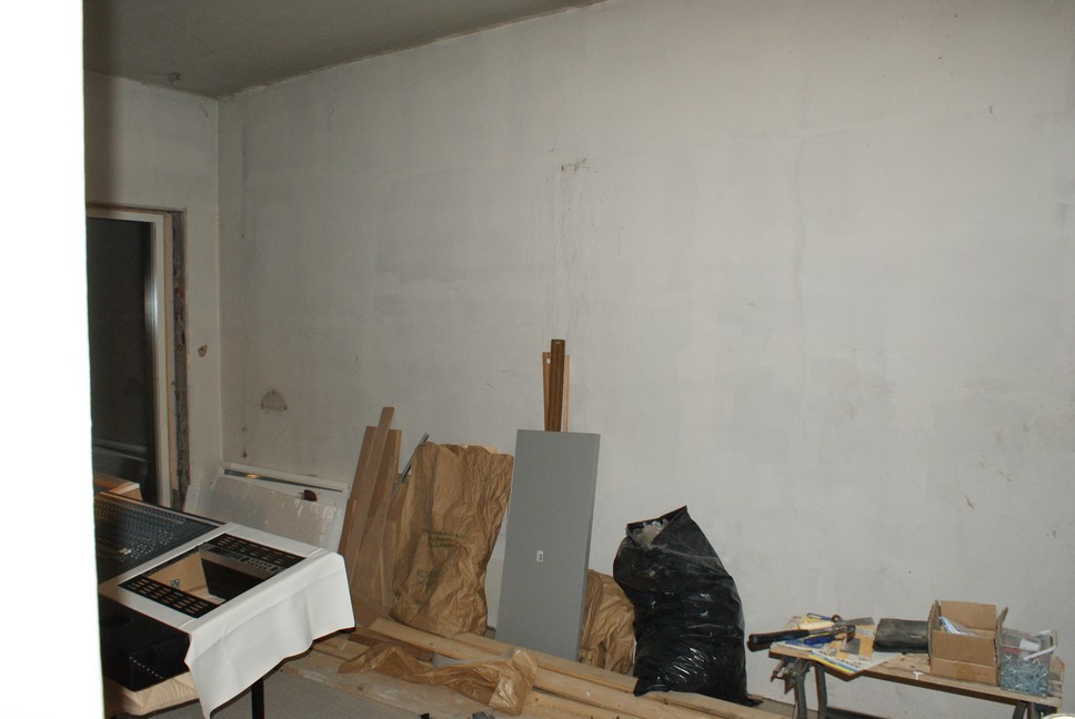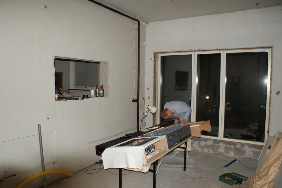 In med syntarna. Ont med plats, så det fick bli hyllsystem från Bauhaus med två vinklade plan och vågrätt plan nederst. Köpte L-formade metallstänger och skruvade fast i de lutande hyllplanen, så att syntarna inte ramlar ner. Mycket stabilt, pga betongväggen systemet sitter i. Överblick över tidigare nämnda absorbenter (saknas en i högerkant vid fototillfället). Hängde även upp ett lutande moln på ca 1 m2 över mixposition. Det gjorde även det en stor skillnad för akustiken i rummet. Jag har inte mätt ett skit med datorn, utan har bara tänkt "biljard", m a o har jag helt enkelt satt upp absorbenter där de "borde" vara enligt mitt sätt att tänka. Dags att fixa det där stora hålet mellan rummen. Väggfärgen är borttagen och en gjutning som står och torkar. Gjutningen är färdig och väggen rengjord. Dags för måleri... Första målningen. I med ena fönstret. Det är ett vanligt treglas argon, 130 x 70 cm. Det ska in en till ruta med luftspalt emellan så småningom. Det här är i dagsläget den svaga länken mellan rummen vad gäller ljudisolering, men det ska bli bra till slut! Snart färdigt... Skitful lampa, men praktisk och riktningsbar. Lampan och 80-talsstrålkastarna är kopplade till samma dimmer. Forts...