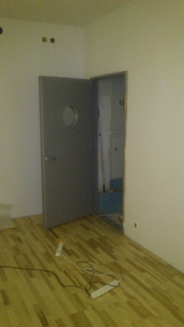 Målning påbörjad. Dosan i mitthöjd av väggen har två stereosignaler framdragna för hörlursuttag. Målning av taket klart. Frånluftskanal i mitten av bortre väggen. Stora väggen fick bli fondvägg. Färg: sparris (lite grönaktig ton som inte framgår av bilden). Färdigmålat. Hål för ytterligare hörlursuttag, samt själva kopplingspanelen längst bort i hörnet. Andra sidan. Servicelucka för golvvärmen. Påbörjat golvläggning... Kopplingspanelen på plats. Det tog ett tag att löda kontakterna. Dessutom hade jag inte lämnat speciellt mycket kabellängd att leka med. Ryggen fick ta en del stryk. Läxa lärd: lämna ordentligt med kabel så du kan löda i bekväm arbetsställning. Kanal 1-8 går till en Yamaha HA8, en ganska transparent 8-kanals preamp med rejält med gain. 9-20 går direkt till mixerbordets preamps, och de är även lätta att koppla vidare till andra pres. A1-A4 går till patchbay, och kan då fungera på många olika sätt. De kan t ex användas för re-amping eller som extra hörlursuttag. Alla keyboards och liknande kommer jag köra genom di-boxar. Jag har blivit svag för balanserade kopplingar på senare tid. Därför är all kabeldragning i studion balanserad. Ett par enheter gillar dock inte att kopplas med TRS, men i de fallen har det löst sig med vanlig TS. Golv lagt. Det börjar ta sig nu. En mycket tung ytterdörr som vi fick tag i begagnad. Det är ytterligare en dörr längre in som går till en hall. Så, här befinner jag mig nu. Det är dags att börja akustikbehandla inspelningsrummet. Jag har ett bra gäng begagnade absorbenttakplattor kvar som är 45 mm tjocka, och jag tänkte komma på något snabbt sätt att snygga till och sätta upp dem. Jag tänkte slippa rama in dem med stålregel för att spara tid, svett och pengar. Att måla dem med t ex väggfärg gör att det bildas ett skal runtom dem (eller?), som inte verkar så bra för absorbtionen. Men skulle sprayfärg kunna fungera? Jag funderar även på att bygga en slags basfälla som även skulle fungera som en slags hög bänk där man kan lägga ifrån sig prylar, typ plektrum, pedaler, lurar och annat. Något liknande den jag såg i en annan tråd (kommer inte på vilken nu). Den skulle bestå av ett ramverk med isolering i, samt slats, men jag är osäker på vilken bredd de ska ha och hur stora gliporna mellan slatsen ska vara. Finns det en enkel "allround"-lösning på det, eller måste man sätta sig ner och räkna?