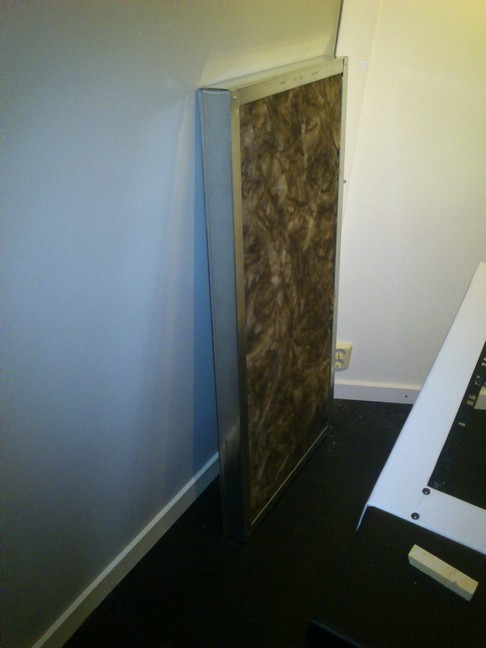 Kontakter och lister. Väggkontakt och TRS för vänster monitor. Monitorerna på plats... TRS-kontakt för höger monitor. Köpte kontakterna färdigmonterade på väggplatta direkt från Hong Kong via Ebay. Kostnad ca 90:- inkl. frakt för två st. Inga tullavgifter på värden under 100 SEK! En till väggkontakt, och så längst till höger 3 x 8 kanaler balanserad multikabel + 4 extra kanaler för medhörning. Väggabsorbent att hängas på vardera sida om mixplats, för att absorbera en del av första reflektionerna. 70 mm isolering i popnitad stålregel. Spraylimmas och kläs med tyg. Hängs upp med vinkelbeslag för att få luftspalt bakom. Ventilationskanal, till-luft, i blivande inspelningrummet. Till höger i bild den större ljuddämparen, inköpt av en trevlig säljare på Lindab. 1 meter lång och ska dämpa bra ända ner i de lägre registren. Högtalarväggen är färdig sånär som på en absorbent som ska sättas i fronten. Det var en del otrevliga efterklangsljud i kontrollrummet efter det att högtalarväggen var klar. Jag kom fram till att ett par akustikplattor över vinkeln mellan taket och väggarna skulle råda bot på problemet. Plattorna skars till efter en skiss i Sketchup och ramades in med popnitad stålregel. Därefter limmades en filt över som sedan täcktes av vitt tyg. Inte 100% snyggt, men lite mysig ökentältkänsla iaf! Stålband som köps på rulle och kan böjas till för att fungera som upphängning. Billig och smidig lösning! Färdig absorbent för högra vinkeln mellan högtalarvägg och tak. Testar position och upphängning. Forts...