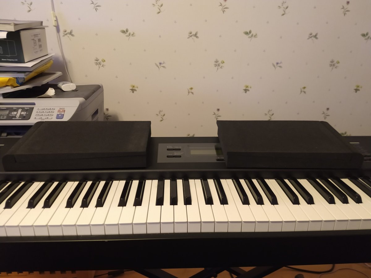 7. Det slog mig att jag kanske kunde lösa "dilemmat" med att använda två stativ till tre st keyboards utan att införskaffa en 2:a nivå (extension) till stativet. Jag använder ju faktiskt varken display eller knappar på mitt stora och tunga stage piano, så därför testade jag att placera min lilla lätta 49-tangenters midi keyboard på själva stage pianot för att se hur det blev. Mellan stage pianot och den lilla midi keyboarden placerade jag ett par vibrationsdämpare gjorda i "foam" som man brukar ha under högtalare/monitorer. Fungerar perfekt utan att funktionsknapparna på stage pianot trycks ner eller ändras då man spelar på den lilla keyboarden. Inte ens om man trycker extremt hårt på tangenterna ska sägas. Pitch bend och modulationshjul på stage pianot är fortfarande synliga och kan användas obehindrat vid behov. En fördel med denna set up istället för att ha en extension så att det blir en riktig 2:a nivå är att den lilla keyboarden inte kommer så högt upp som den annars hade gjort. Det gör att även den (och inte bara stage pianot) kommer på en bekväm höjd att spela på trots att jag sitter ner. Stabilt blev det också liksom att jag nu kan placera den lilla keyboarden så att oktaverna på den hamnar precis i linje med oktaverna på stage pianot undertill. Supernöjd med denna lösning måste jag säga! Tycker heller inte det rent estetiskt ser så tokigt ut faktiskt. Nu väntar jag bara hem mitt beställda Arturia Keylab MKII 61 (black) som är tänkt att stå på det andra stativet och vara placerat under skrivbordet som ni ser på bild nr 4. Tror det blir en bra helhetslösning med denna "ommöblering" i lilla studion.. 🙂