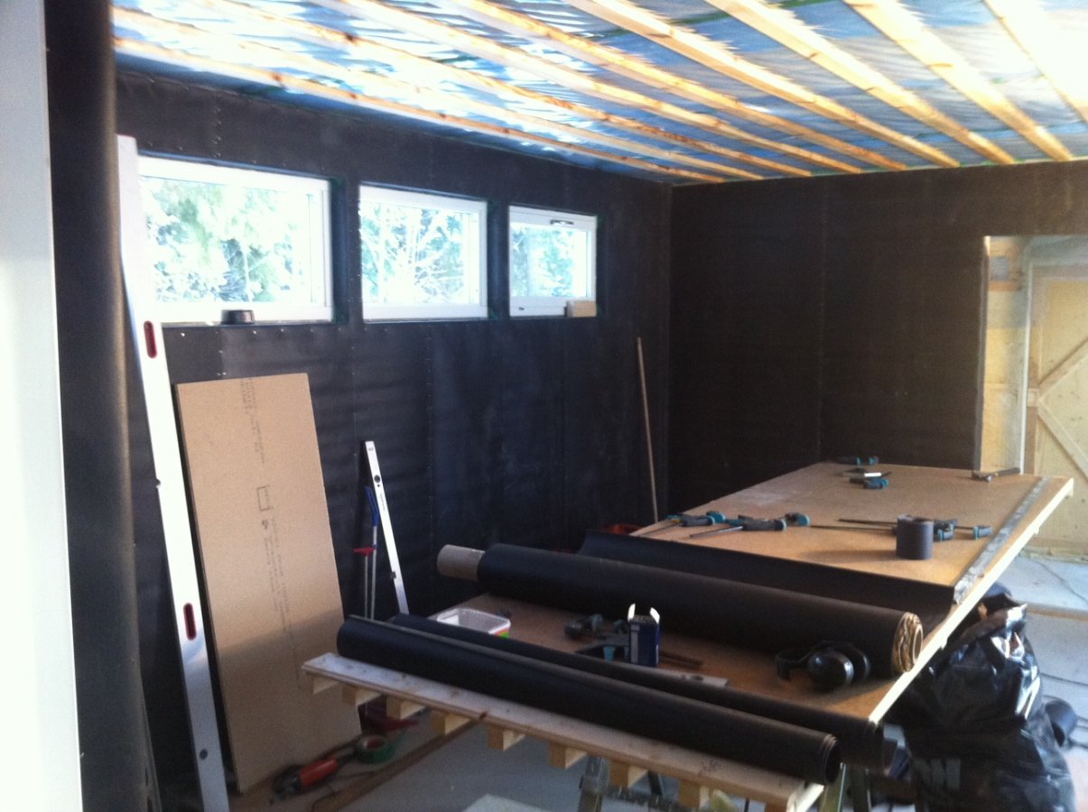 Grundförutsättningarna var att bygga studion intill huset där jag bor. Min önskan var ett kontrollrum på ca 25m2 samt ett liverum på ca 10 m2. Båda rummen flytande och med idealmått för att undvika stående vågor i så stor utsträckning som möjligt. Jag ville även ha en direktkontakt med naturen utanför, så det blev till att specialbeställa 45 dB 4-glasfönster. Men jag tar det från början. Efter ritningar var gjorda så började schaktarbetet, gjuta plintar samt resa stommen. Hela stommen skruvlimmades och dimensionerades alá overkill :-) fortsättning följer..