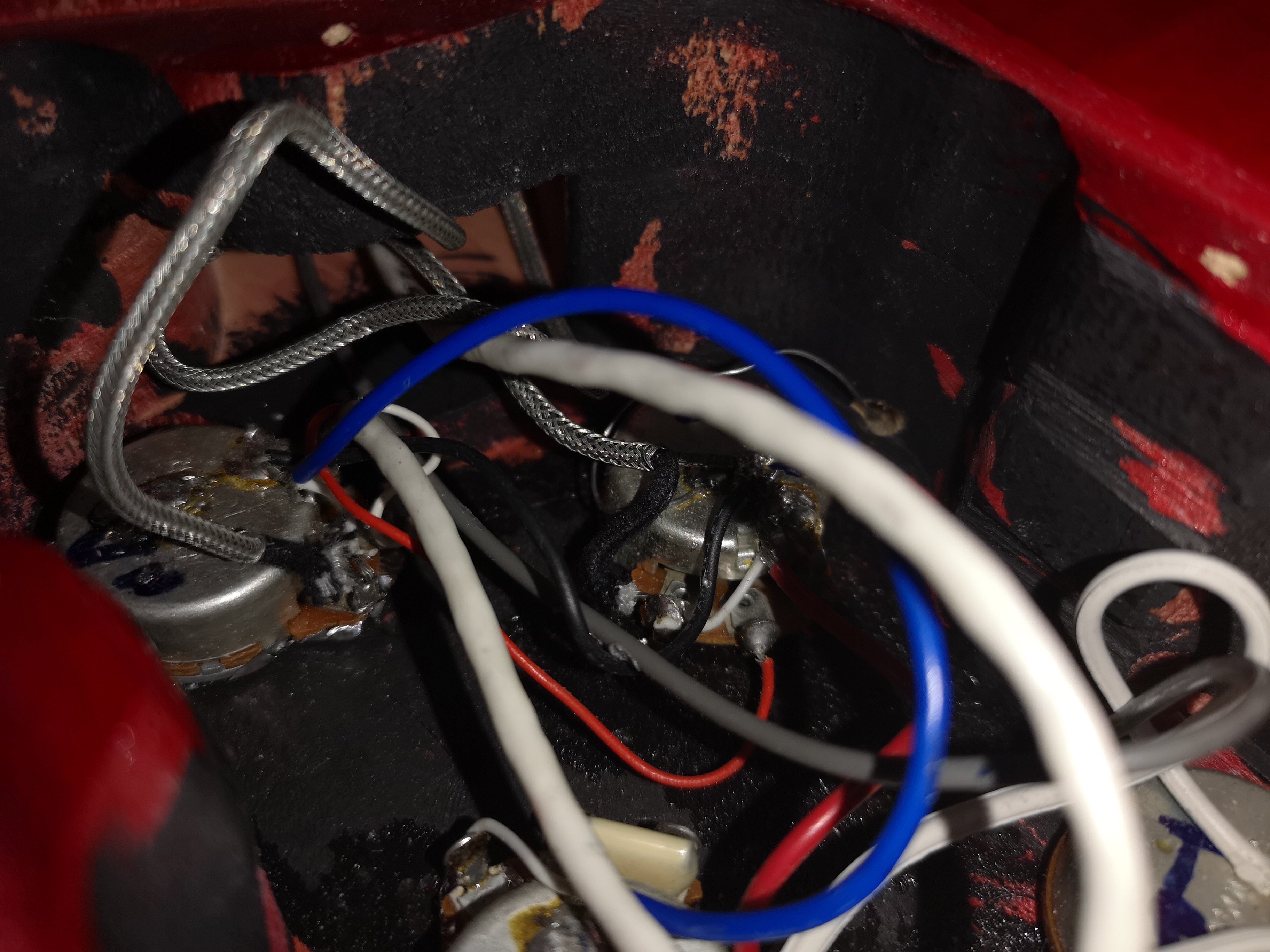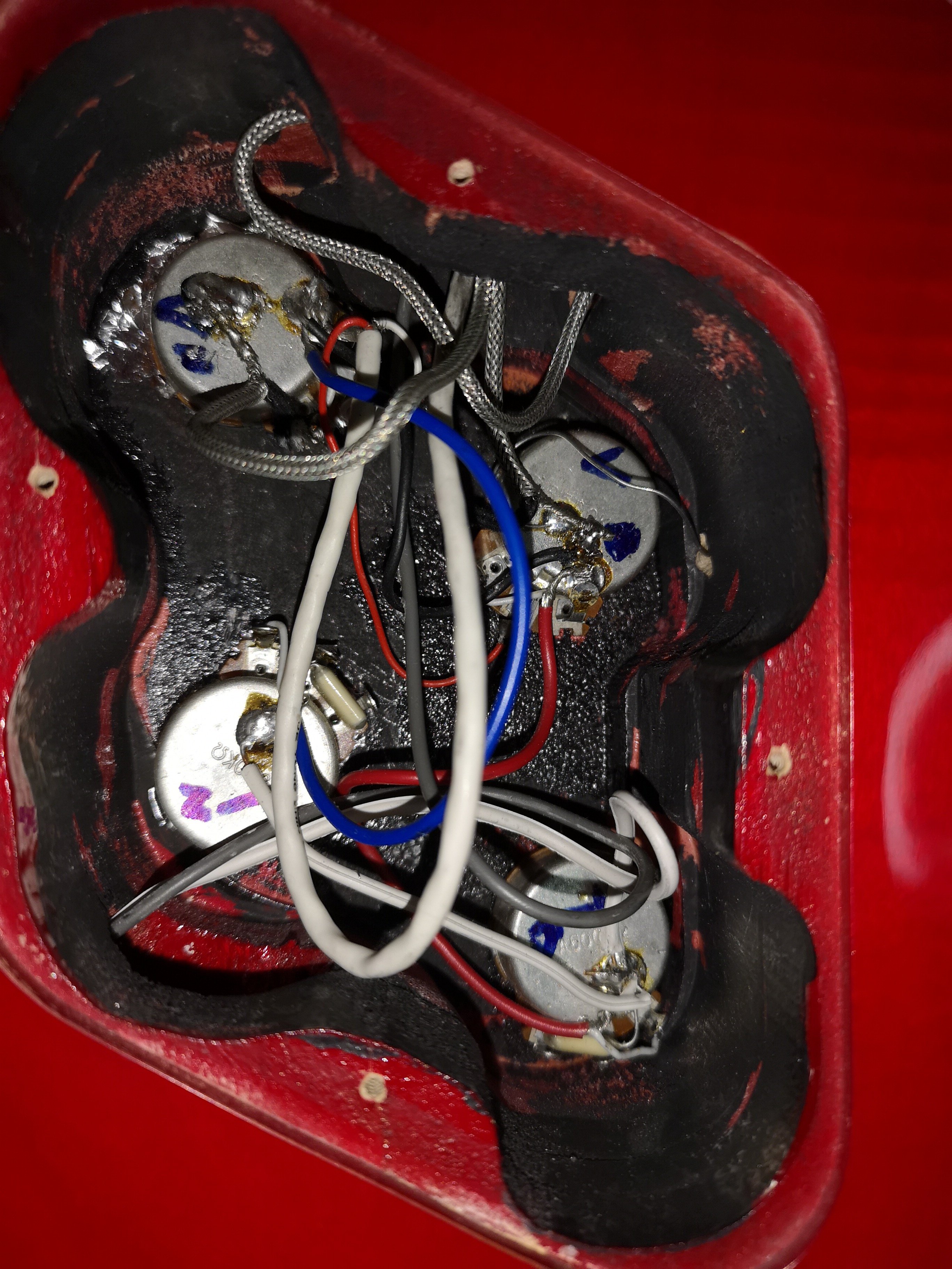Vad jag kan se finns bara skärm och en ledare från båda mickarna och det konstiga är att allt verkar vara (eller i alla fall avsett att vara) kopplat enligt epiphone standard. Se bild. Det ser inte katastrofalt ut men det är ingen med stor lödvana som har monterat de nya mickarna. Hade det funnits separata ledare hade jag kunnat koppla in några brytare för att labba själv men nu är jag osäker. Jag har inte lyft ur mickarna ännu och det KAN ju finnas ledare som inte är framdragna till pottarna. Vill inte förstöra mer innan jag låtit någon som förstår bättre titta på den men hittar jag ingen lösning får det bli att demontera mickarna och dra ut separata ledare så att jag kan testa mig fram. Som gitarren låter nu så är den ändå helt oanvändbar för mig.