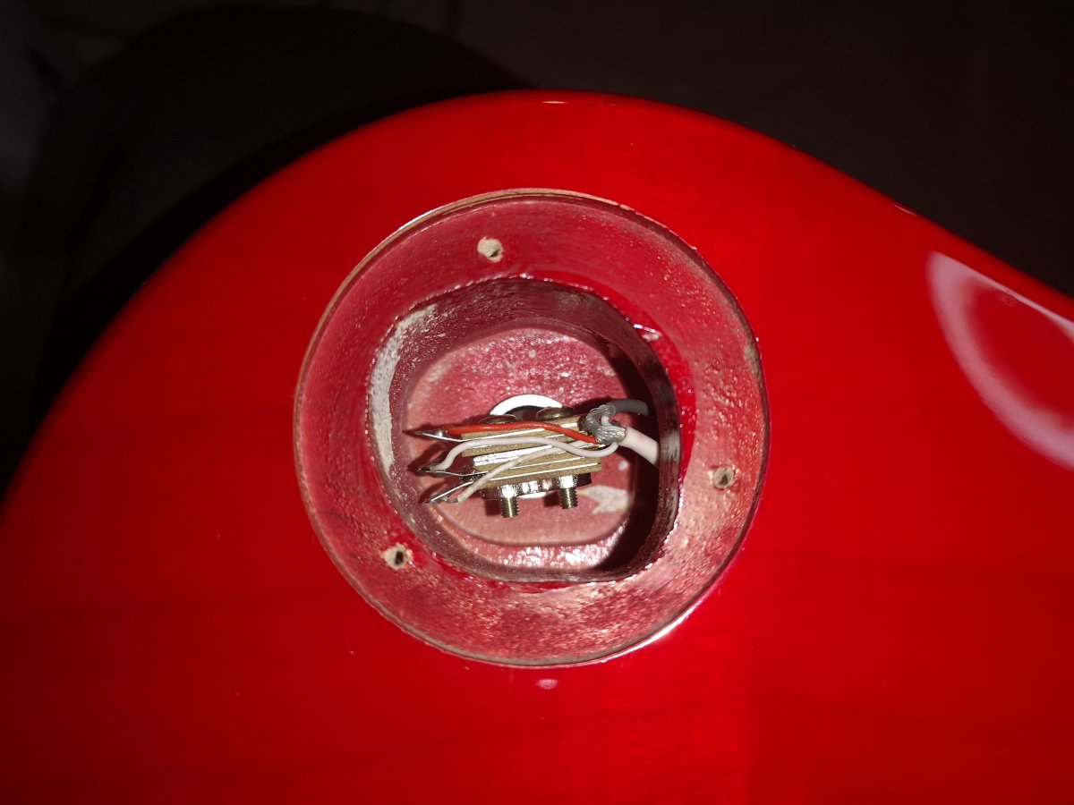 Omkopplaren fungerade däremot inte riktigt. Det var ingen skillnad mellan halsläge och mittläge. Dessutom var det lite lätt glapp i telejacket. Som den fullkomliga idiot jag är öppnade jag baksidan och rotade lite försiktigt med omkopplaren och tittade till pottar och telejack. Omkopplaren fungerade visserligen "bättre" men mittljudet var helt borta! Panik!
