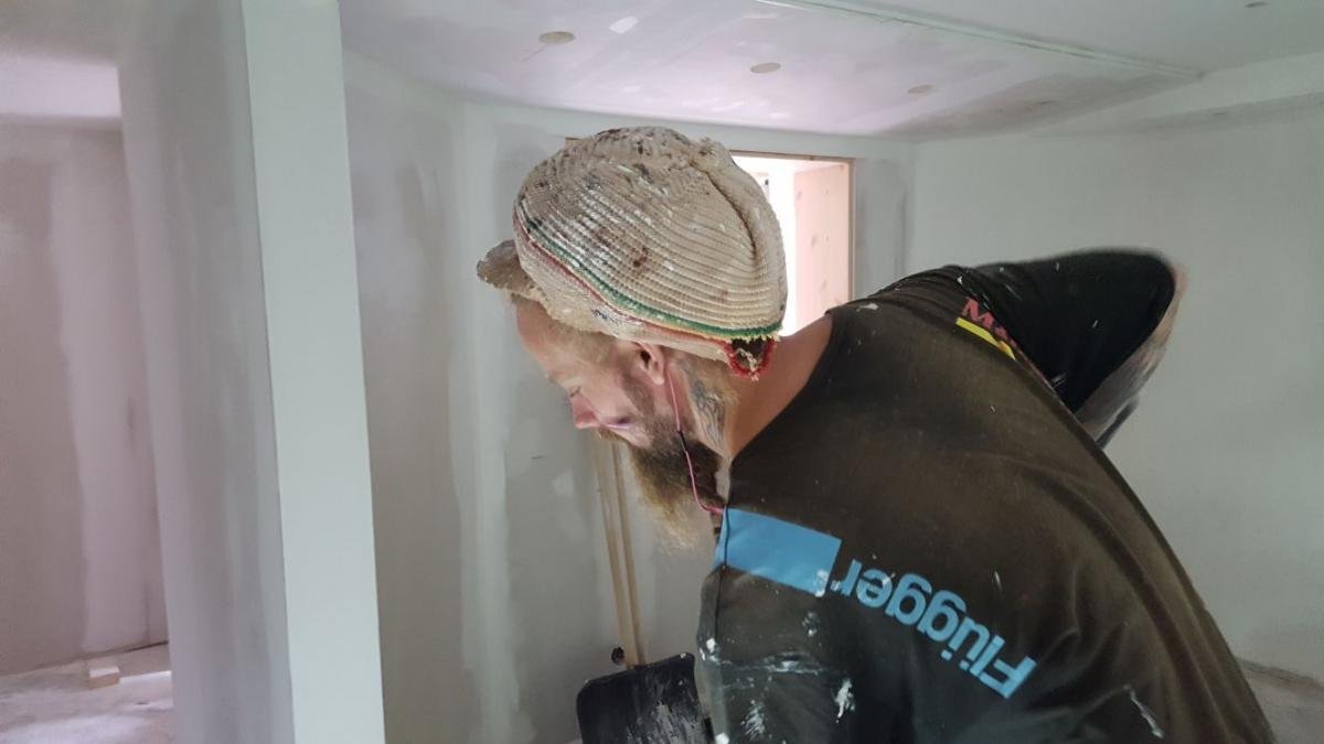 Nu har vi börjat målat! Grundar först med vitt. Sen blir det bruna väggar och lite träpanel! Säg hej till vår målare, Benny Blanco!!