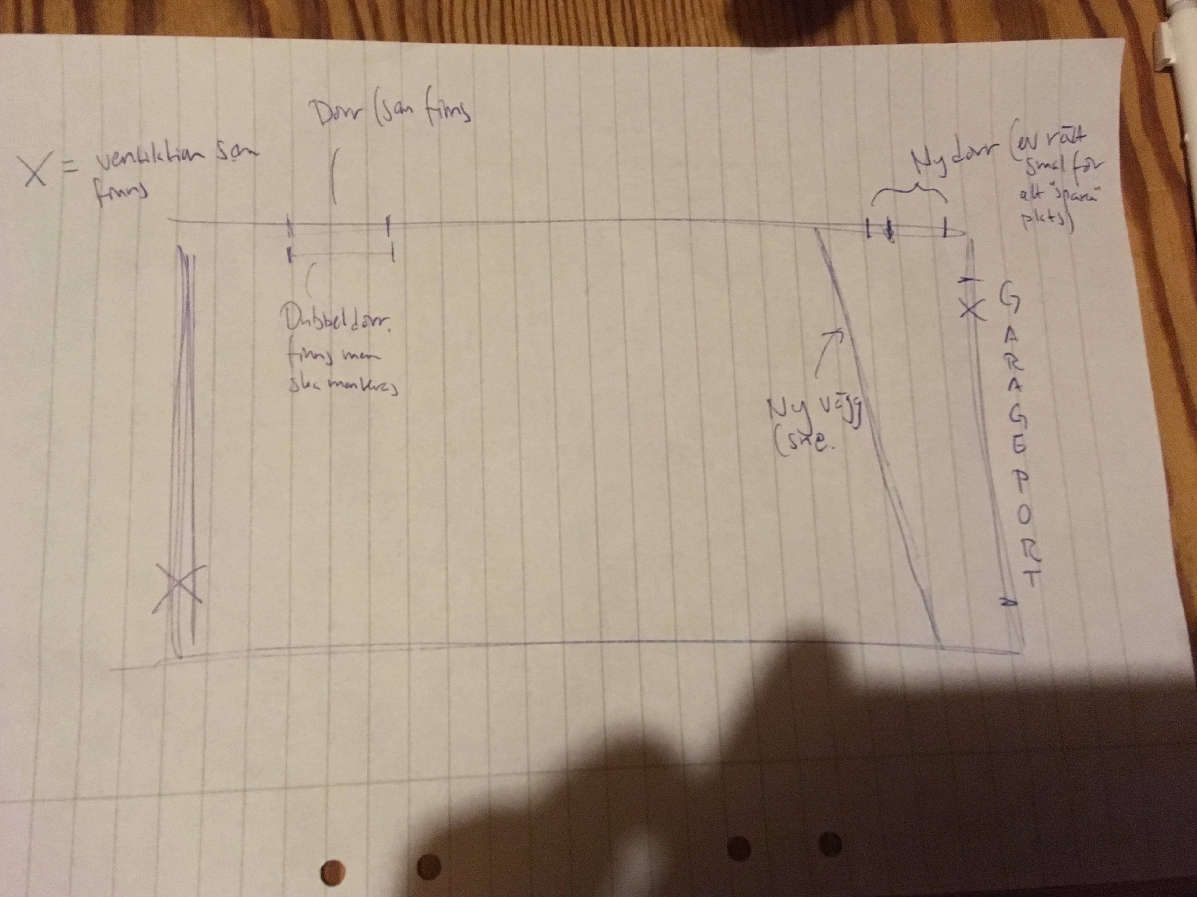 Förrådet blir mellan garageporten (som inte kommer att öppnas) och den nya väggen (som jag tänkt sätta lite snett för att motverka stående vågor, dock kanske inte lika snett som på min fina skiss:))