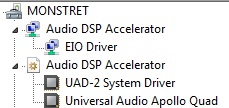 Det finns även 2 st "Audio DSP Accellerator" varav den ena är Apollo och UAD 2 (ska man ha två? hade ett UAD PCIe i datorn innan, men det har jag tagit bort) och den andra heter EIO driver som jag inte har en aning om vad det är. Testade att innaktivera den utan någon succé