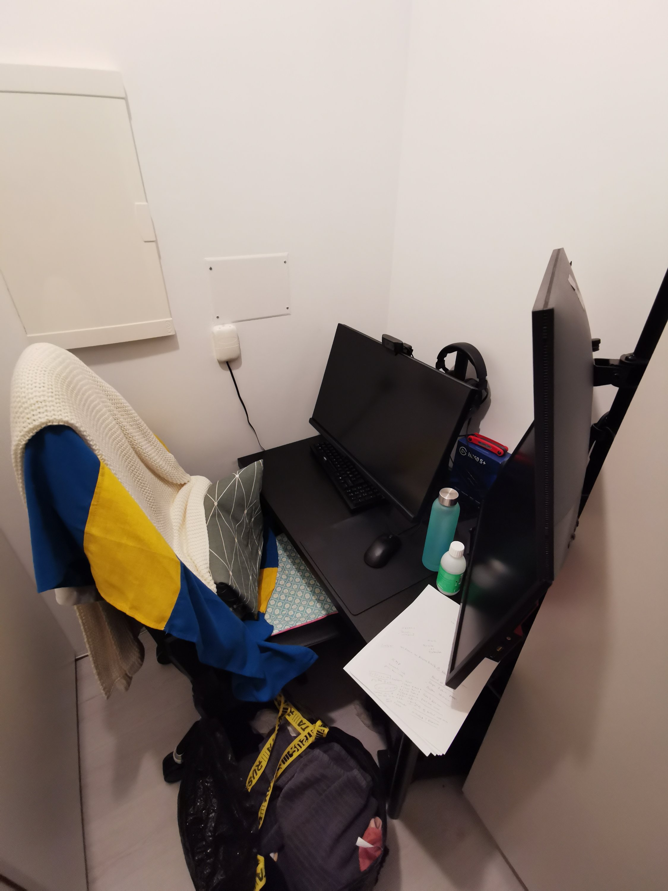 Har en s.k gamingstol, PAX garderobsystem med skjutdörrar bakom samt en mindre PAX garderob på 50 cm höger om mig som är vår städskrub.