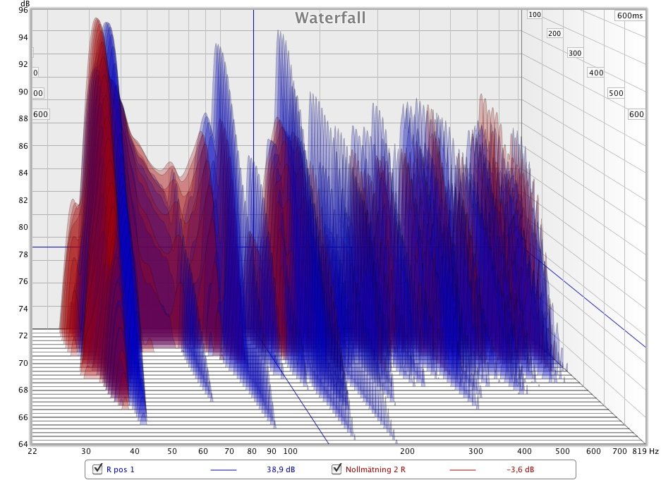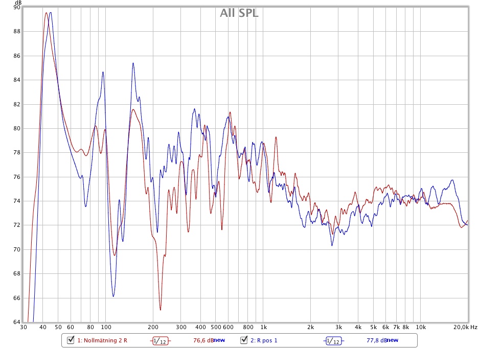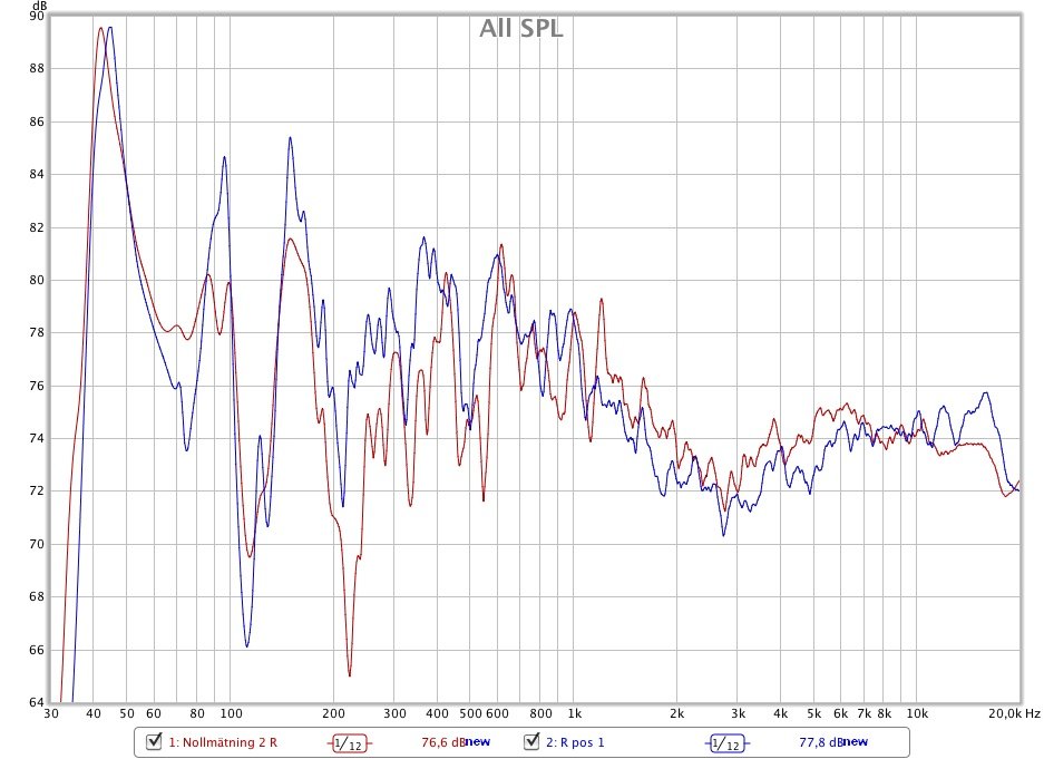 Jaha, så var det dags med en liten uppdatering Har kommit den del emellan. Detta har hänt. Vi har skruvat upp ett lager råspont under bjälklaget till undervåningen, samt skruvat ett lager gips på detta och fogat flitigt. Syftet med detta är ljudisolering, akustiken har hittills förvärrats eftersom vi hade 20 cm mineralupp fritt i hela taket tidigare. På gipsen kommer ett lager läkt för att ge plats åt el för belysning, sedan ytterligare gips, vilket blir ytskiktet. Har gjort tre rektangulära ursparningar för att bygga panelresonatorer, helmholtzare eller vad som nu beräknas behövas när vi kommer dit. Dessa kommer alltså att hänga ned något från det omgivande taket. Har idag gjort några kompletterande mätningar. Dels en jämförande mätning för att se skillnaden av byggåtgärderna, dvs i tänkt monitorplacering höger med micken i Sweetspot. Utöver detta har jag även mät vänster monitor, samt höger och vänster i pos 2, där jag dragit fram dem 10 cm på förslag av Gilbert som skulle dra någon slutsats av detta (har glömt vilken). Generellt ser basregistret lite stökigare ut och decay-tiden har ökat mellan 100-1000Hz, vilket inte behövs. 😛 Blått är dagens mätning med monterat innertak, rött är tidigare mätning då isoleringen låg öppen. Har dessutom spelat upp sinustoner för alla stora peakar och dippar upp till 300Hz och promenerat runt i rummet. I princip alla frekvenser bumlar mest i hörnen. Lite osäker på vilka slutsatser jag skall dra av detta? T ex tänkte jag bygga olika moduler i taket, stämda till olika frekvensintervall. Hur planerar jag bäst vilken som sitter var för att få max effekt? Nästa steg är att bygga en bamsehelmholtz och jobba sig uppåt i frekvens. Något mer jag borde mäta innan grejerna plockas ned igen då det skall dammas och byggas på nytt? Här kommer impulserna: R pos 1.wav R pos 2.wav L pos 1.wav L pos 2.wav Tack för ikväll! // T
