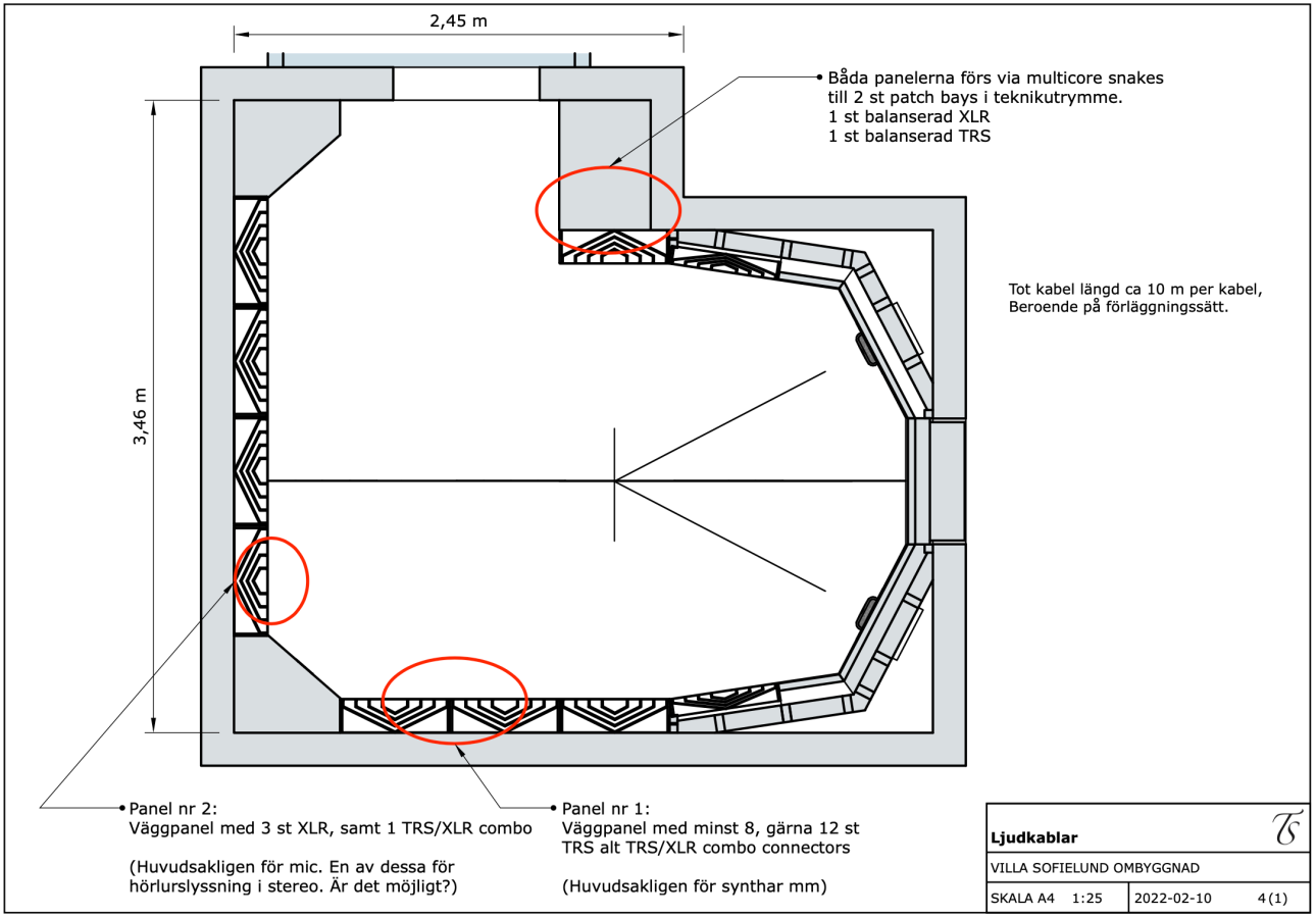 Håller på med ett studiobygge och behöver lite råd och tips om någon här gjort något liknande. Se nedan en skiss över det aktuella rummet. Dator, ljudkort och studiorack kommer att ställas i ett teknikutrymme till vänster om sweet spot (uppåt i bild), medan en trave syntar kommer husera till höger (ned i bild). I bakre högra hörnet tänkte jag sätta mic för sång och skulle även vilja kunna ha dit hörlursuttag. Istället för att dra kablar tvärs över rummet (eller klamra längs väggarna) så skulle jag vilja göra en dold installation där man pluggar in grejerna i väggen där de står och sedan går allt till patch bays i teknikskåpet, där man kan koppla om ifall man behöver. Har idag läget synthar kopplade till alla 12 inputs i ljudkortet, och ifall man vill använda fler måste man kunna switcha. Bygget pågår just nu. Söker kontakt med någon som antingen kan ge råd (second opinion på föreslagna inköp av material och verktyg, samt tips kring utförande) eller om någon rent handgripligt vill hjälpa till mot ersättning. Panel 1: Här vill jag kunna koppla in mina existerande syntar som är både i stereo och mono med vanlig plugg. I dagsläget har jag tre stereopar samt två monosynthar. Det kan ju hända att det blir fler... Dessutom vill man ju kunna ha kompisar på besök med ytterligare leksaker (syntar, elgitarr, elbas osv). Obs, vill kunna routa hit signaler (mono) från patchbay för att kunna köra en signal genom syntarna som en outboard effekt, t ex sång genom vocoder eller gitarr genom någon av syntharna filter osv. En dum fråga: vinner man något på att mata in en obalanserad signal i en balanserad signalväg, eller är det att kasta pärlor för svin? Tänker jag rätt här? Panel 2: Huvudsakligen för sång eller annan inspelning via mic (gitarr, stråk, Foley) som kräver phantom matning. Har även ett elpiano med balanserade XLR output som jag tänkte kunna koppla in här. Och om möjligt skicka hit en hörlursmix till sångare (då i stereo). -