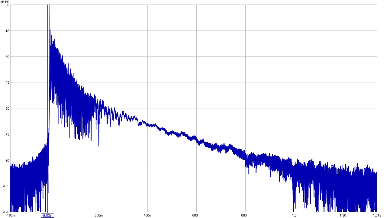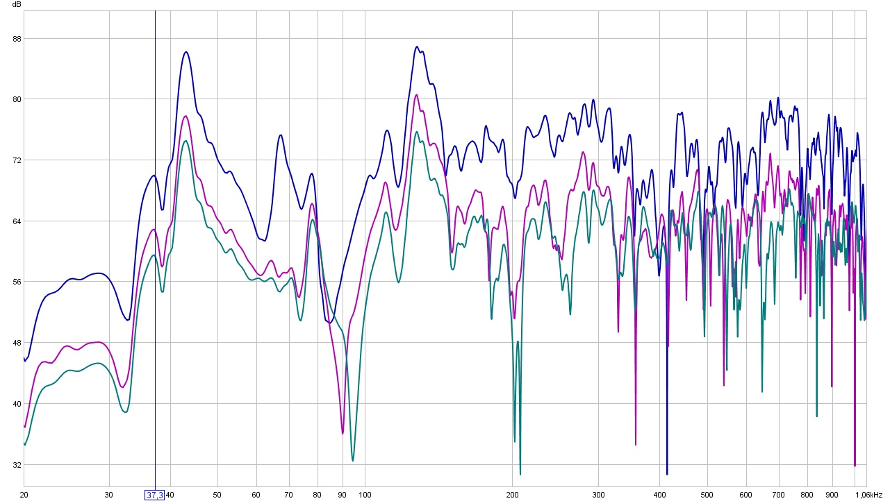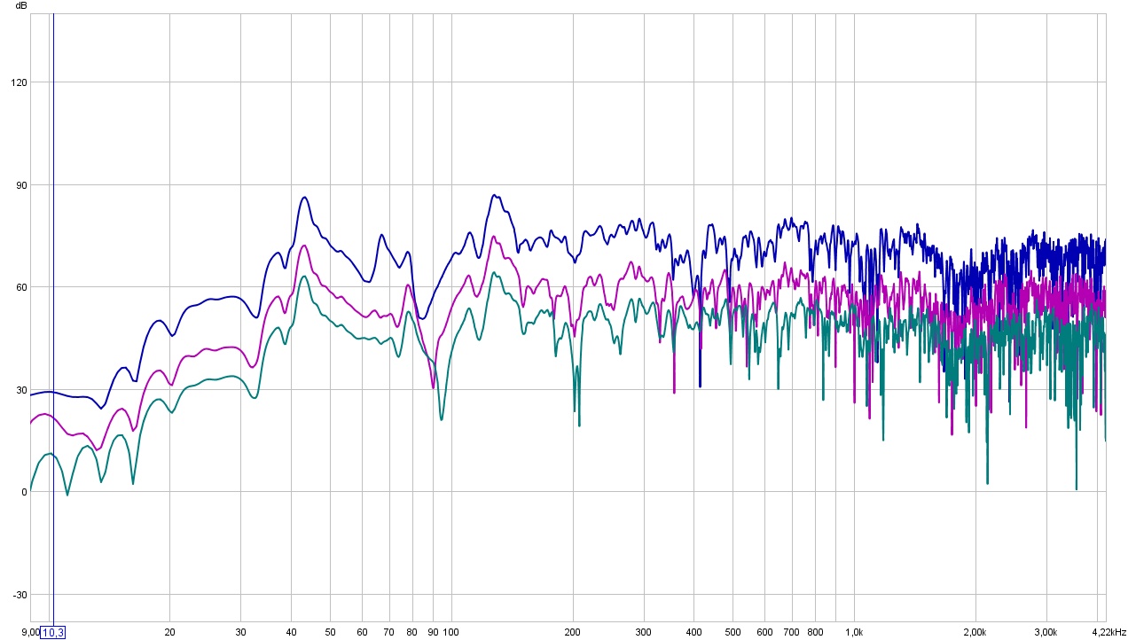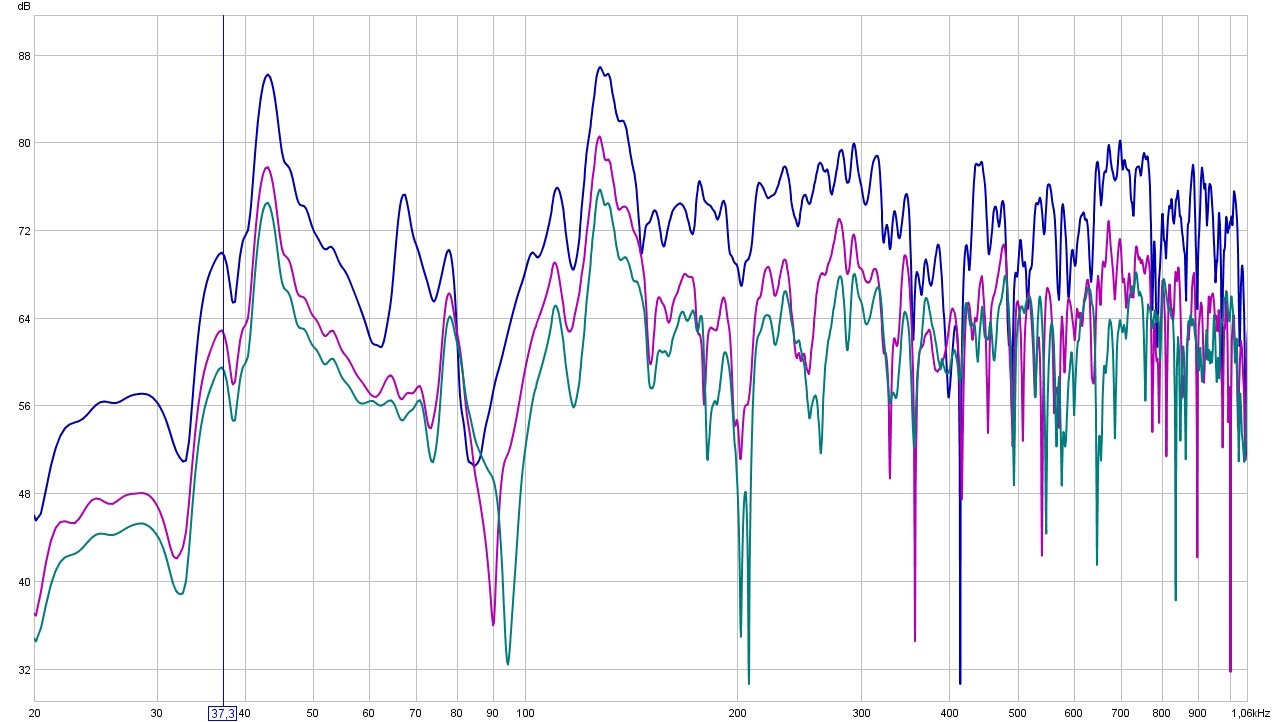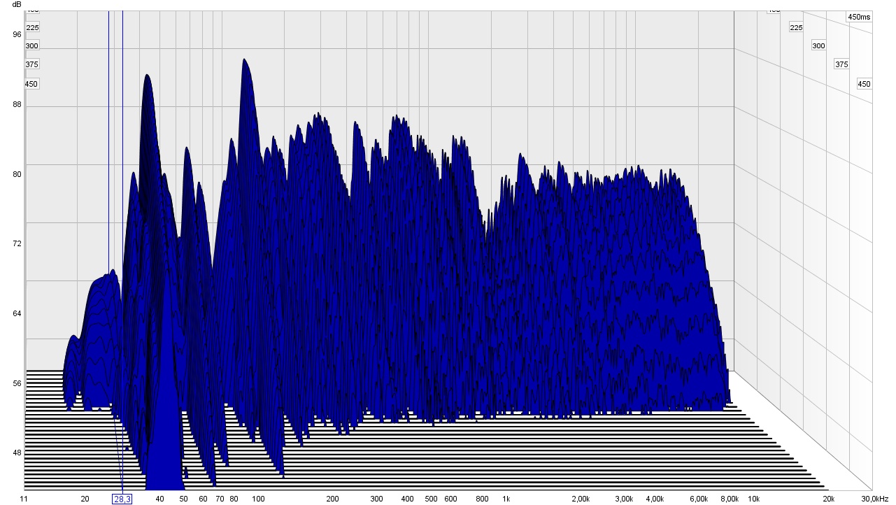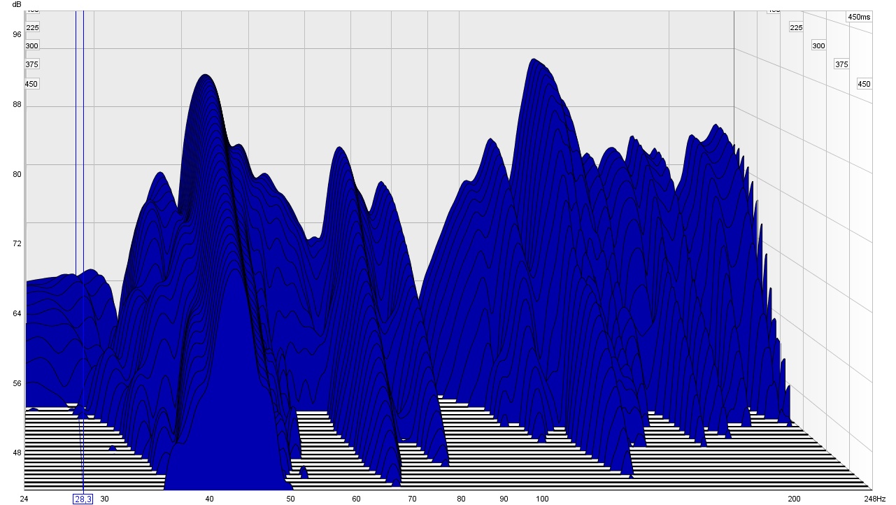 Skalan på axlarna var helt enkelt de som de råkade vara i REW (å de visar trots allt det som var viktigt ändå) Vattenfall De pucklar (å dalar) som verkar vara prio ett att försöka hyvla till känns som kring (40), 80+ och 130 Hz ETC Säger den vad som finns kvar i energiväg i förhållande till tid? (Energi av vad? Impuls?) Och som jag skriver ovan... Jag förstår att läget e rätt surt. Med tanke på geometri det redan byggda studiobordet och rummet storlek(vilket ju iofs innefattas av geometri,... hmm). Men vill göra det mindre dåligt... I min förra (dvs i våras nån g innan vattenskada å djävelskap) mätning så spårade jag de första axiala noderna å de verkade stämma rätt bra med att räkna på rektangulärt om jag kommer ihåg rätt...
