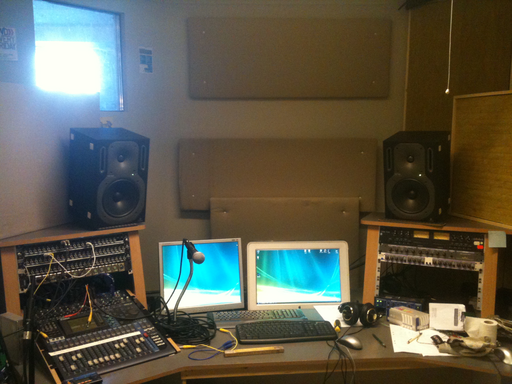 Hursom... Har idag fått på plats lite absorbentprototyper... måttligt bra bild... Den översta i mitten ska förmodligen tas bort. Den undre i mitten används just nu bara för att hålla den mellan högtalarna på plats... ska bort Testat lite varianter av högtalar placeringar... Får det inte att stämma med matematiken... SBIR handlar i första hand om en fjärdedels våglängd? Med flytt i sida fick jag på höger högtalare att dippen flyttade från ca 90 Hz - till 95 Hz? Men 90 Hz => 0,25lambda = ca 0.95m ? vilket inte matchar nåt avstånd avgränsningsyta till höger baselement? Mätmässigt verkar det iaf i frekvens haft måttlig inverkan med det jag provisoriskt fått upp... Hurpass funkar markskiva som bredbandsabsorbent... ? (misstänker att det e rätt hårt pressad glasull...) Att det gör nåt var rätt enkelt att bekräfta. Skrek i ren vägg å i skiva å skillnaden var stor. Misstänker att man måste på med mer djup än det jag satt upp bara. Hörnet skall antingen fyllas med mer material för att göra mer i lågfrekvens... Alternativt tätas å göras till nån sorts avstämd resonator... Avståndet till lyssningsplats från kortväggen är nog närmre en fjärdedel av längden än en tredjedel... Mätte idag men glömde såklart att skriva ned det... ska man backa bordet och försöka få upp monitorerna på stativ bakom bordet i ungefär den position de har nu... (om än något högre) Tänkte använda utrymmet som ändå inte går att använda till nåt bakom bordet till avstämda fällor... å det verkar finnas en heeel del kring 80 Hz nere kring golvet å runt bordet å fram mot kortväggen... Skall undersöka det mer...