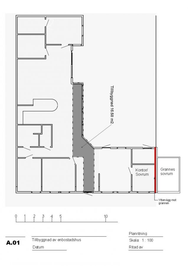 3. Hej alla! Söker för närvarande bygglov för en tillbyggnad på huset och behöver hjälp med hur jag uppnår ljudklass C för en yttervägg som är mot grannen. Finns det någon som kan hjälpa mig kanske? Bilden visar min blivande planlösning och det är rödmarkerat där min yttervägg möter grannens. Hur uppnår jag ljudklass C? Och väggen ska även klara av brandklassen EI60, alltså att den ska klara av brand i 60 minuter. Mvh Niclas