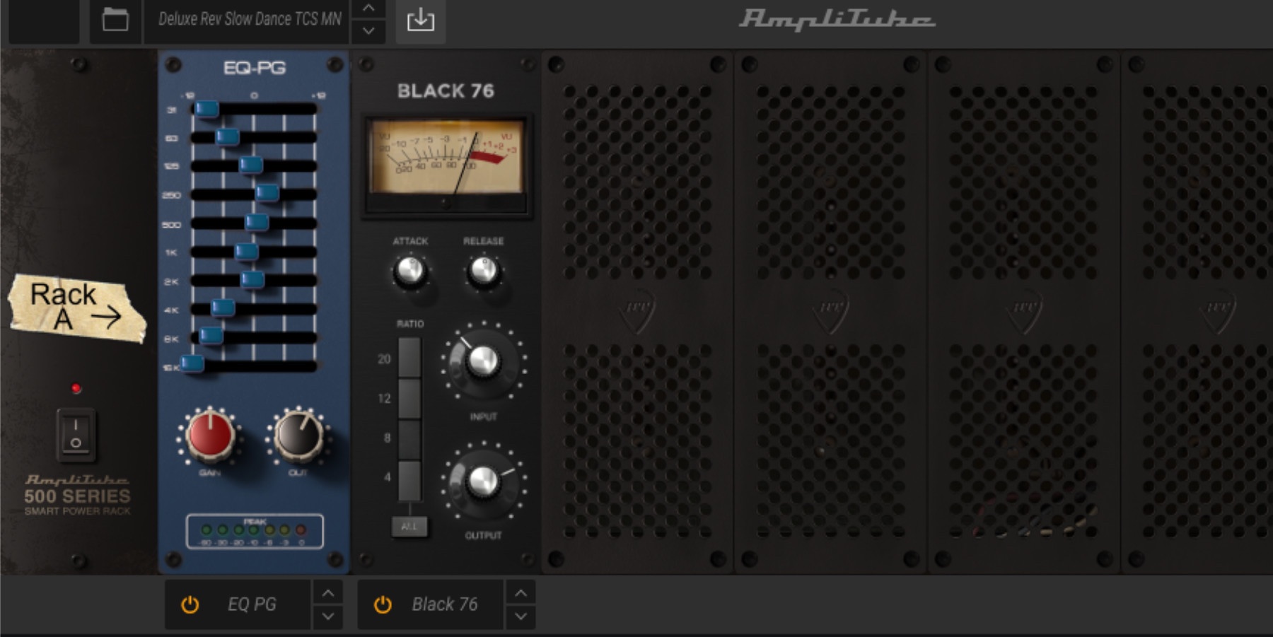 Det är väldigt svårt att säga hur mycket kompression du ska ha på olika instrument, eftersom inspelningar varierar väldigt mycket. Du får lyssna på låten och justera efter tycke och smak. Just när det gäller elgitarr kan man säga att ju mer distorsion du använder, desto mindre nytta gör en kompressor eftersom distorsion i sig begränsar dynamiken i ljudet. I bilden nedan ser du kompressorn placerad i Rack A efter högtalaren.