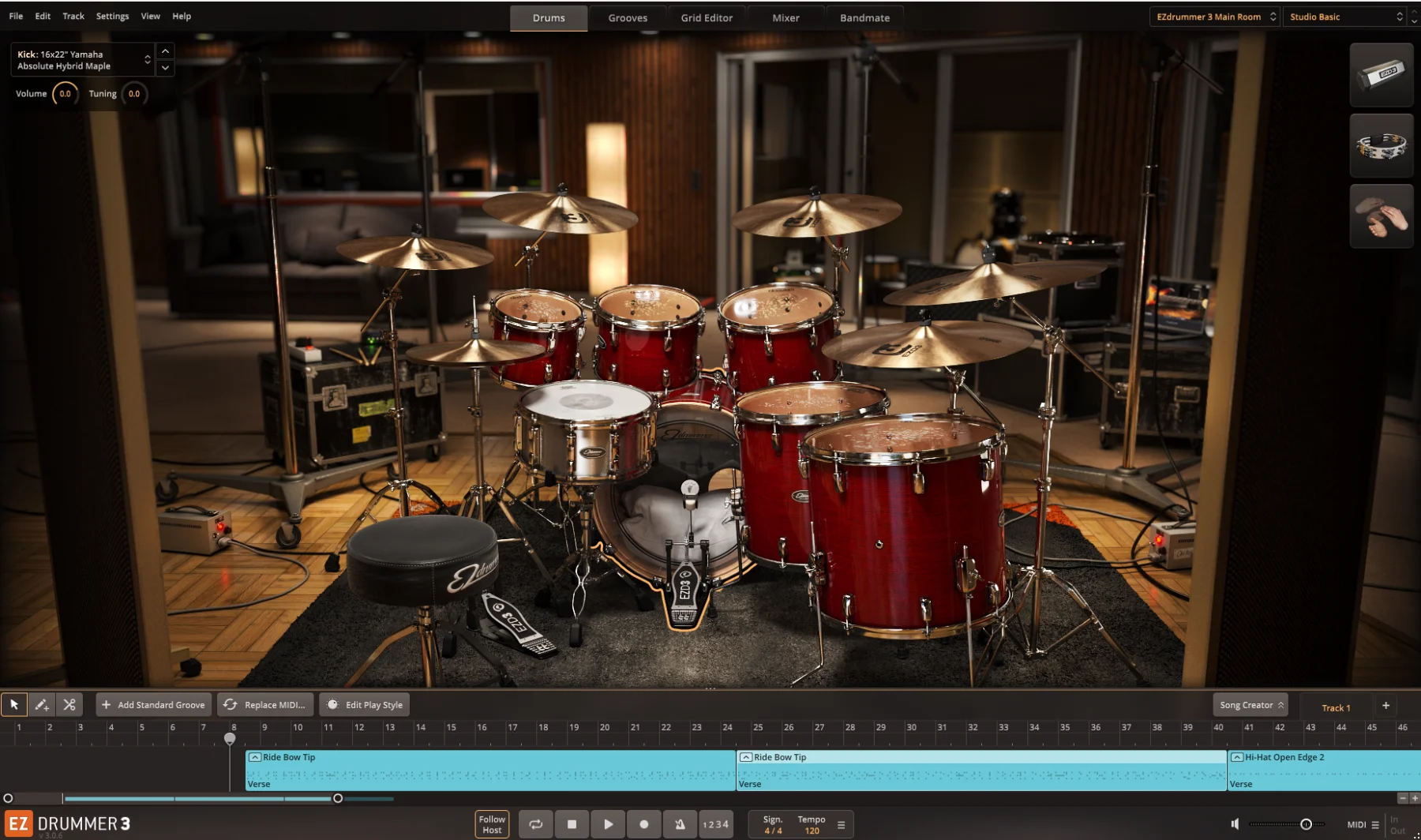 Nästa steg blir att addera lite svänga trummor med EZdrummer 3. Precis som i EZkeys 2 kommer detta mjukvaruinstrument fullmatat med färdiga grooves och inspirerande komp i olika stilar. Vi bläddar snabbt fram till jazzbiblioteket och prövar några olika intron, verser och refränger tillsammans med pianot. Här kan vi också välja att låta EZdrummer 3 lyssna på EZkeys 2 genom funktionen Bandmate och skapa ett eget specialanpassat komp. Valet faller dock på några färdiga jazzkomp från MIDI-biblioteket som passar pianokompet ypperligt. Vi drar och släpper och förflyttar oss längre och längre in på den rökiga och sprudlande jazzklubben. Trummorna känns levande och inspirerande och ljudet från EZdrummer 3 Main Room och Studio Basic-kitet träffar precis rätt.