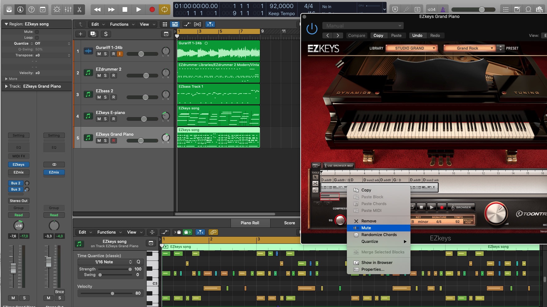 Alldeles oavsett om du väljer att arra upp din låt inuti EZ-instrumenten eller inte så bör du ägna ett par extra ögonblick åt instrumentens inbördes ljudkaraktären samt den övergripande mixen. Lägg till EZmix 2 på klaviaturspåren och pröva några av förinställningarna via blädder-vyn (Browser). Du kommer höra en positiv skillnad direkt. Testa även att byta master-inställning på EZmix på stereo-ut-kanalen för att höra vad som händer.