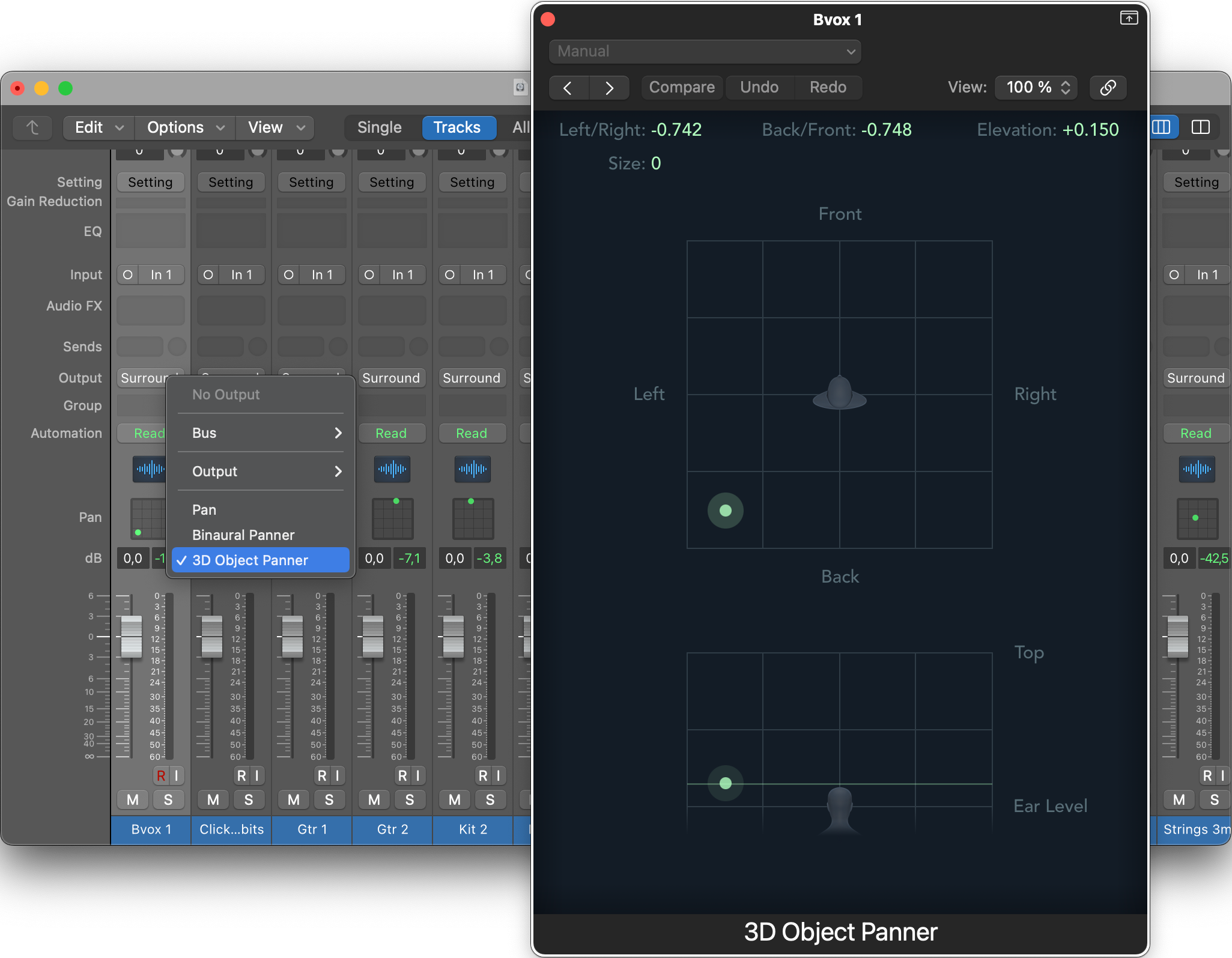 För att börja mixa behöver du bara förstå två olika koncept: Beds och Objects. Beds är det tidigare sättet att mixa surround, där flera ljudspår balanseras manuellt till högtalarna. Objects däremot är ett nytt sätt att hantera ljud på och som Dolby har utvecklat, där du ger varje kanal sitt eget virtuella objekt. I Logic Pro går du till Output i kanalstrippen eller i mixern och väljer ”3D Object Panner” vilket gör om kanalen till ett Dolby Atmos-objekt. Nu ser du i stället en panoreringsruta (Pan), med en liten grön punkt som representerar objektet. När du flyttar objektet räknar Dolby Atmos Renderer automatiskt ut hur ljudet ska ändras spatiellt för att du ska uppfatta att objektet byter plats i ditt virtuella rum. Om du dubbelklickar på ytan får du upp ett fönster där du kan finjustera placeringen bättre och även ange från vilken höjd i rummet som ljudet ska komma.
